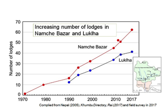 As shown in Figure 5, the growth of tourism during the 1990s and 2000s coincided with the building of dozens of new lodges throughout the Khumbu. The combination of increased tourism and lodge numbers also accelerated demands for imported food and goods, such as wine, whiskey, and hard liquors (glass bottles), beer and soft drinks (aluminum cans), water and soft drinks (plastic bottles), canned food items (tin or steel containers), and shipping and packaging materials.