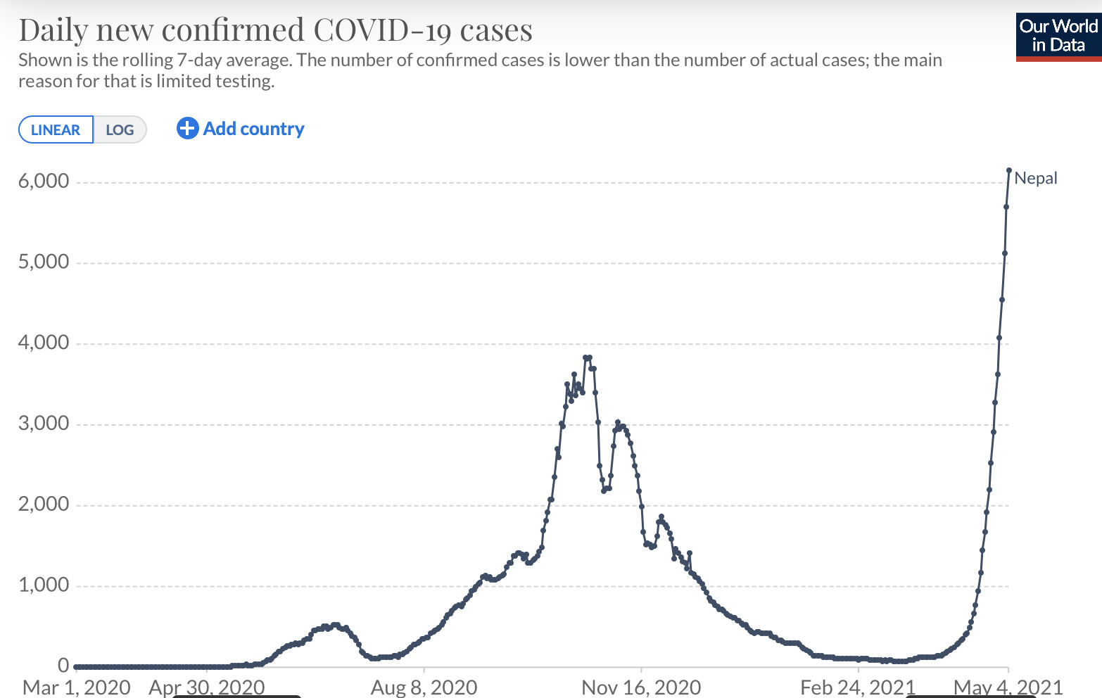 “Nepal saw 127% increase in infections this week, the pace of the spread of Covid-19 here is much higher than most of the countries in the world,” said Archana Shrestha of Kathmandu University during the Ministry of Health’s daily briefing on 5 May.