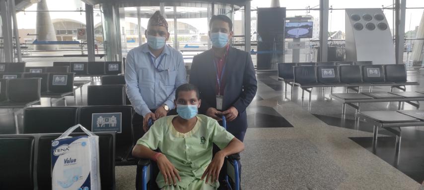 Private airlines were hesitant to accommodate a stretcher but Nepal Airlines agreed. The Nepali mission put pressure on the employer to bear the medical and travel costs.