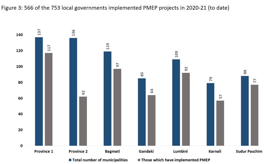 In Narayan municipality, for example, CMEP is expected to employ 1,000 individuals for 50 days in 22 projects. Of the 3,000 people registered for PMEP, less than 500 received some form of work.
