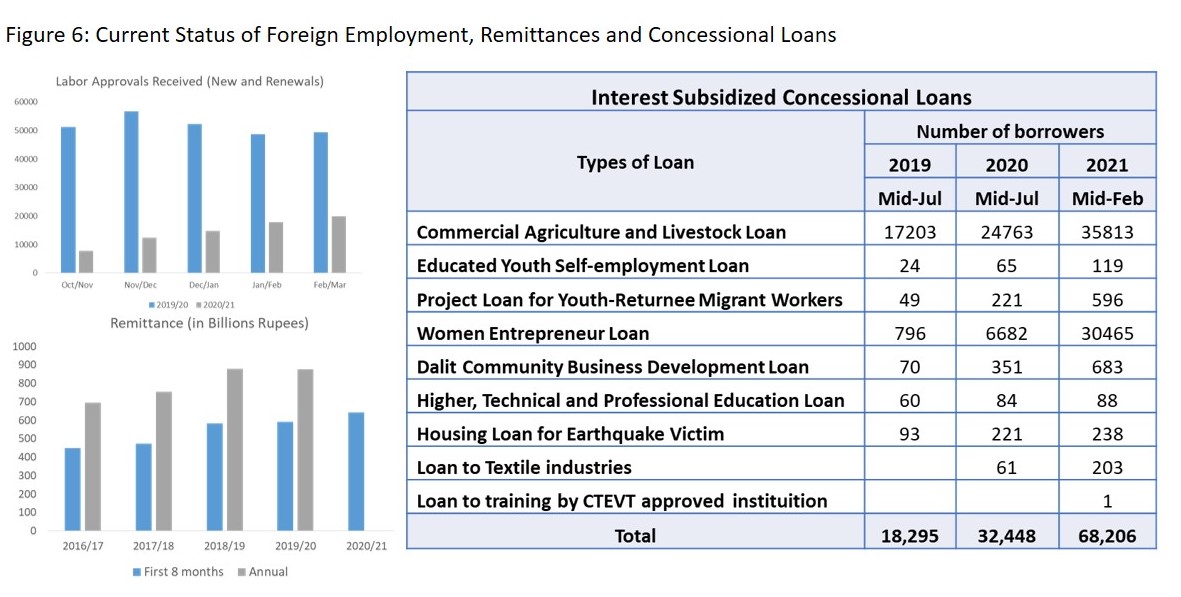 According to the World Bank Covid-19 monitoring survey, two out of five economically active workers reported incidence of job loss or prolonged work absence. Internal migrants are returning back to their villages en masse. Seasonal migrant workers from India are reeling under the second wave. Emigration to third countries beyond India is picking up, but slowly and unevenly. The macro-picture of remittance may have defied predictions so far but many have lost their overseas jobs, and with it an important income source that has served as the only reliable safety net. Disbursement of the government’s soft loan programs to encourage self-employment initiatives have shown modest improvement but are far from the desired targets. (See Figure 6)