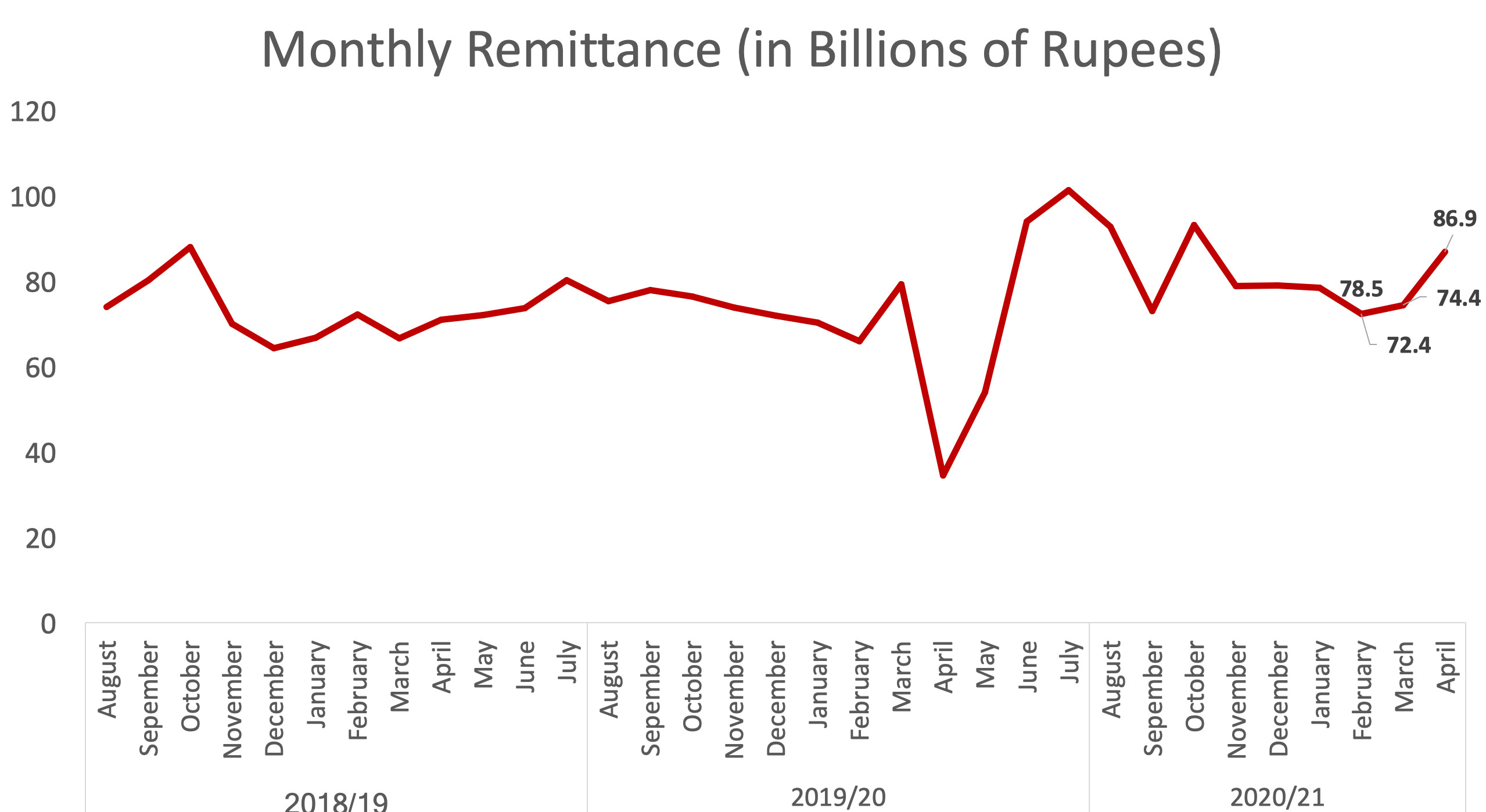 Last year, in the same review period, remittances fell by 4%. In the immediate months after the lockdown, there had been a drop from Rs79.3 billion in March 2020 to Rs34.5 billion and Rs54 billion in April and May 2020 respectively. But in 2021, Nepal received Rs86.8 billion in April alone.