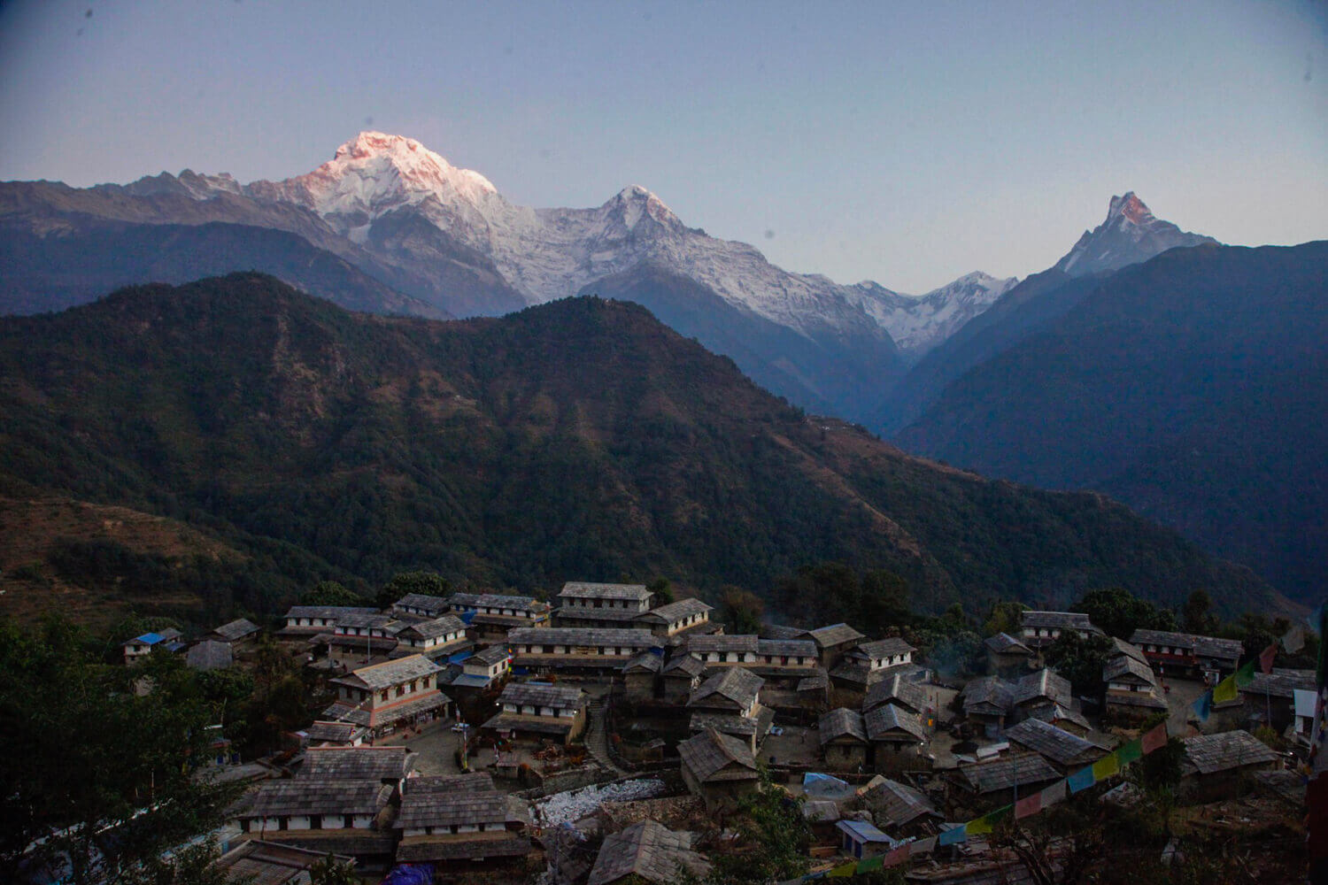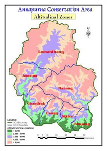The Annapurna massif stretches nearly 7,700sq km from Marsyangdi in the east to the Kali Gandaki, and is Nepal’s biggest nature reserve spanning 16 rural municipalities. It has some of the greatest altitudinal variation on the land surface of the earth. From below1,000m above sea level, the terrain rises to more than 8,500m, giving the region its rich biodiversity.