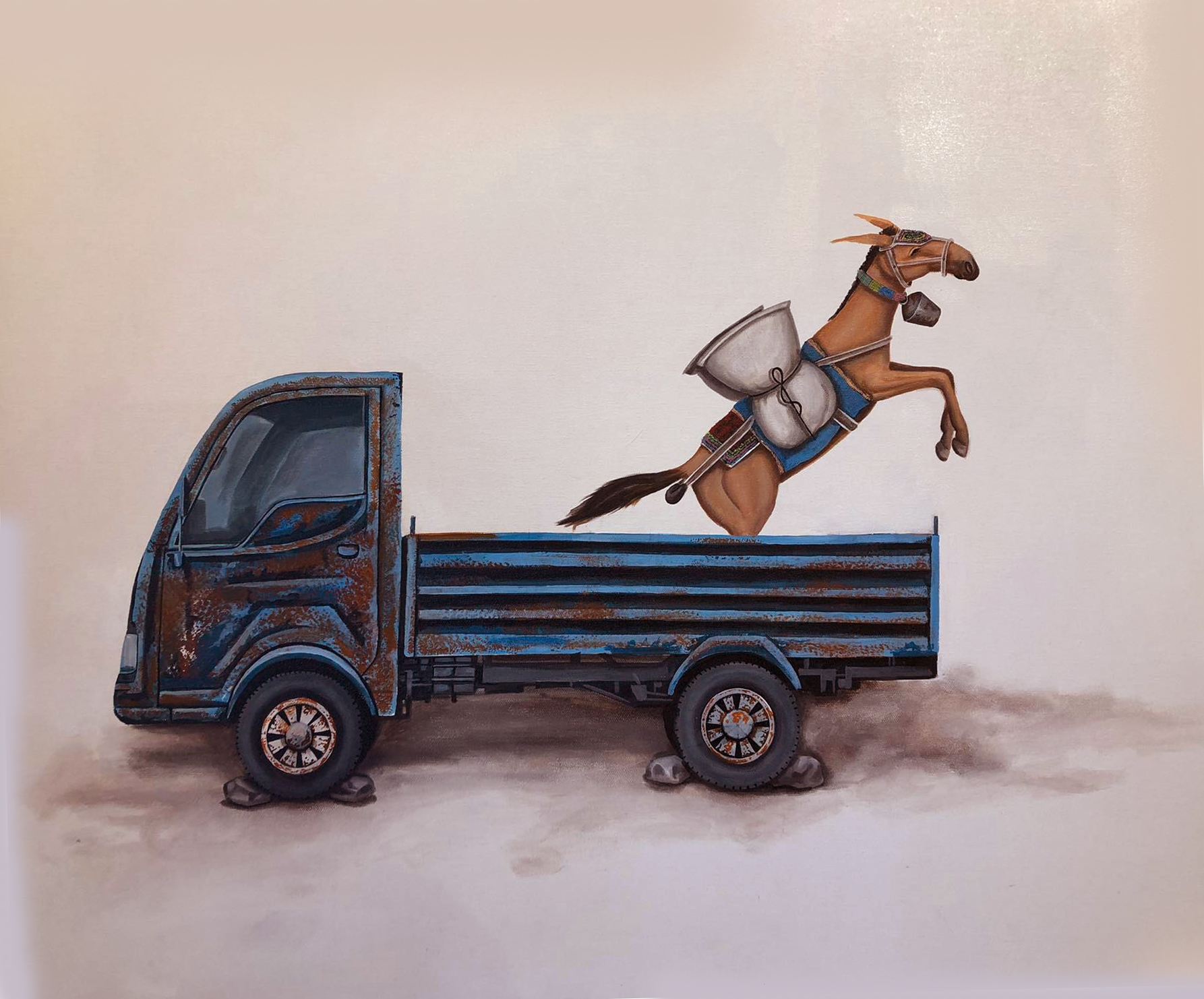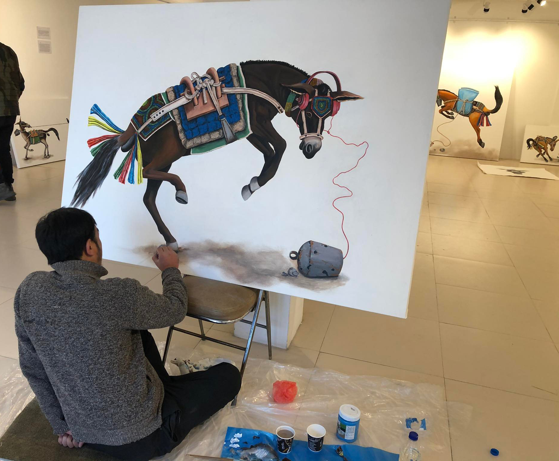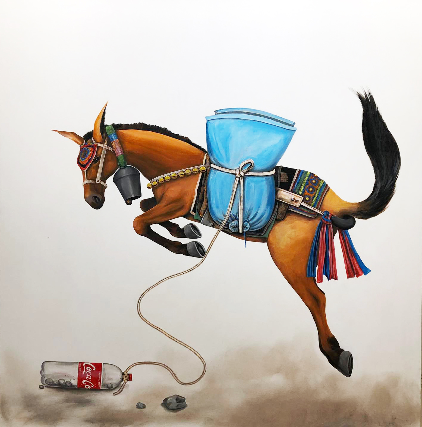 One of the first paintings that comes into view as visitors climb the staircase to the vast gallery is called Lale: a brown mule leaping with its tail up in the air. Its dark, melancholic eyes gaze ahead as the blue sacks on its back weigh it down. A long rope attaches the mule to a sealed Coca Cola bottle with crystallised rocks inside.