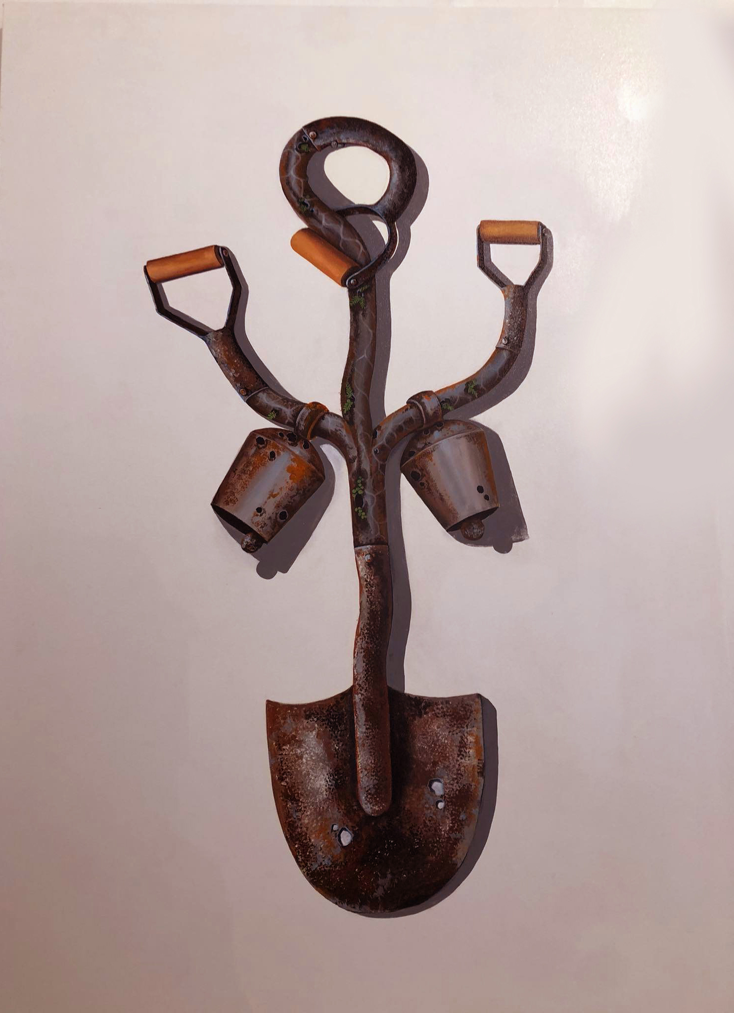 Some paintings depict items scattered around mountaineering camps: steel plates, cylinders, rusty wheelbarrows, a yellow excavator and a sewing machine practically falling apart. One canvas has a rolled-up roti held together by a safety pin. There is a larger statement here against the recklessness, entitlement and egotism of mountain visitors.