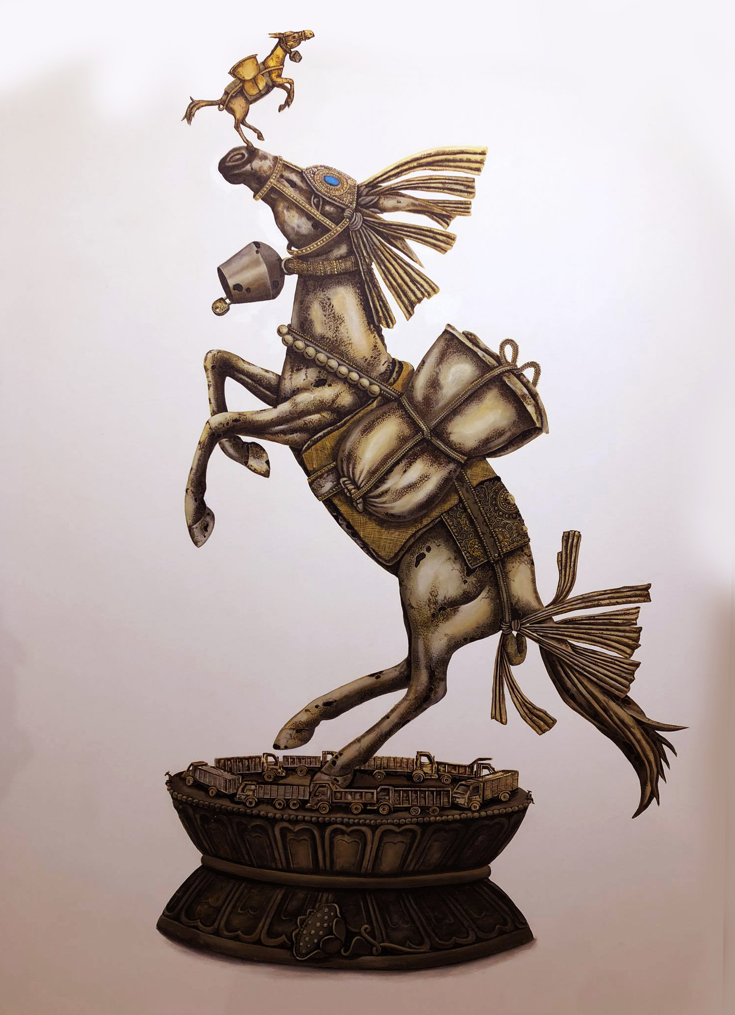 'Most visitors and strangers would tell me about the creatures', writes Rai in his statement, 'saying that they would cry if they did not get heavy loads!' But, as evidenced by his paintings, the mules do not look happy to be carrying all those sacks and cylinders.
