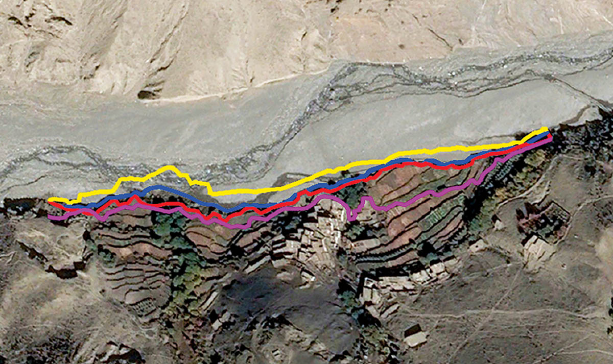 For Lubra, this is disastrous. Living on the edge of the riverbank, families are sitting ducks. When the monsoon season concludes, new sediment sets and hardens like concrete, increasing the height of the riverbed, making the village more susceptible to damage. Over the last decade alone, the riverbed has risen by an astounding 12m in elevation, and buried terrace farms.