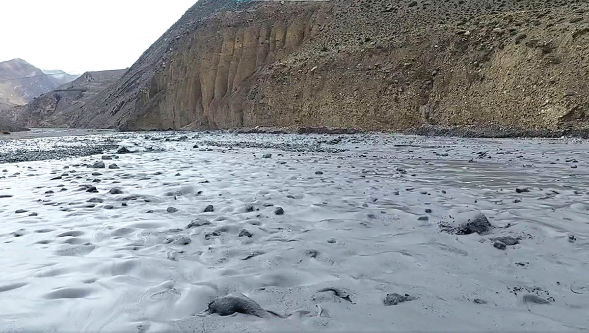 This turns the valley into a concrete mixer, as the sediment-stone-water turns into a viscous sludge. Higher up the valley, the water may not always be able to find passage through the sludge, causing it to be dammed. Eventually, the blockage gives way, bringing down a rush of aqueous concrete. These flood bursts repeat without fail over two months and swallow any obstacles in its path.