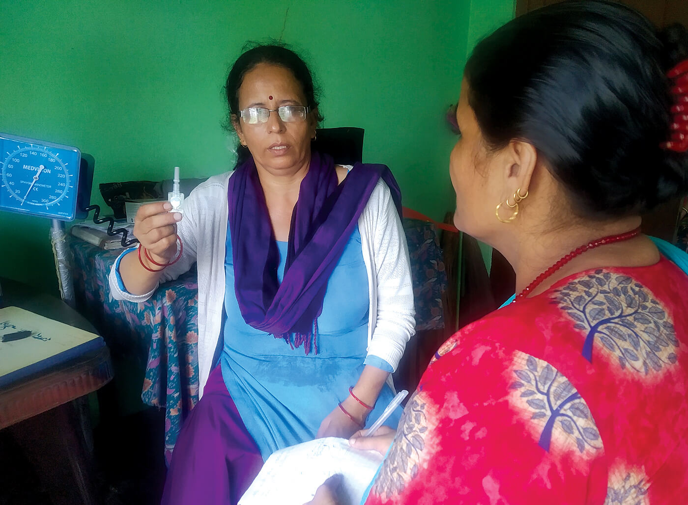 But auxiliary nurse midwife Sharada Rimal (pictured, left) tells her about Sayana Press. Its advantages over Depo-Provera are that it comes with its own small needle, the dosage is much smaller, it is less painful and can be self-injected.