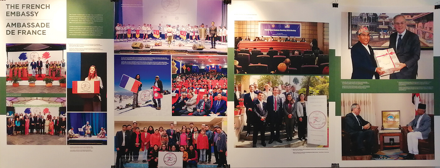 All these events, and much more, are on display at Alliance Française Kathmandu, in a photo exhibition marking Nepal-France ties over the centuries. Highlighted are the past 70 years of the modern diplomatic relationship, with photographic evidence filling the white walls of the auditorium, including the Prime Minister KP Oli’s visit in June 2019.