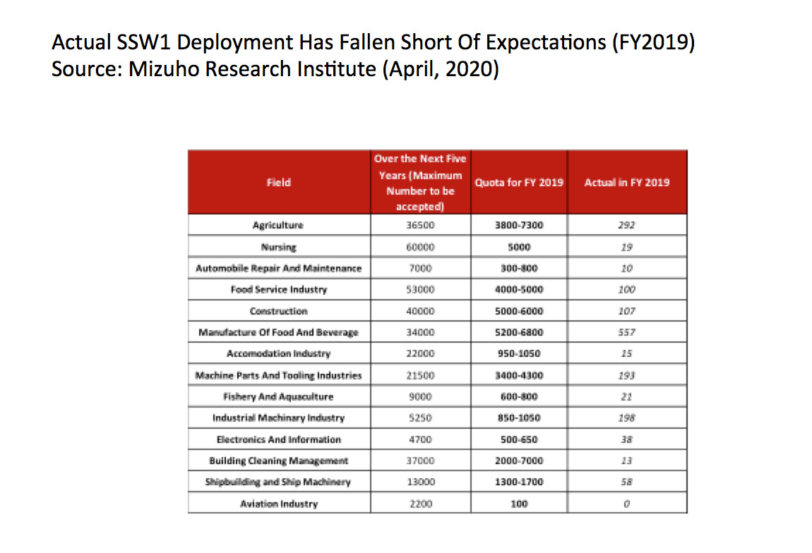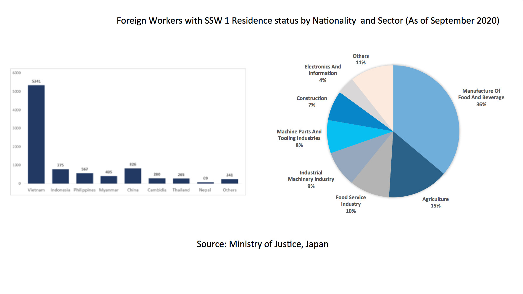 Started in April 2019, SSW1 visas have only been issued to 8,769 workers (see figure) as of September 2020, which is less than a tenth of the target. Over 60% are from Vietnam, followed by Indonesia and the Philippines. Many of them were already based in Japan under other statuses, who simply changed their residence status to SSW1. For a program that has had a bumpy start, the onset of Covid-19 further derailed progress.