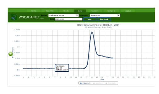 The importance of having high altitude weather and snow monitoring stations was also shown by the sudden increase in snow depth (1.65m) on the Rikha Samba Glacier in Mustang (5,200m) during the Hudhud cyclone on 15 October 2014. (See graph below.)