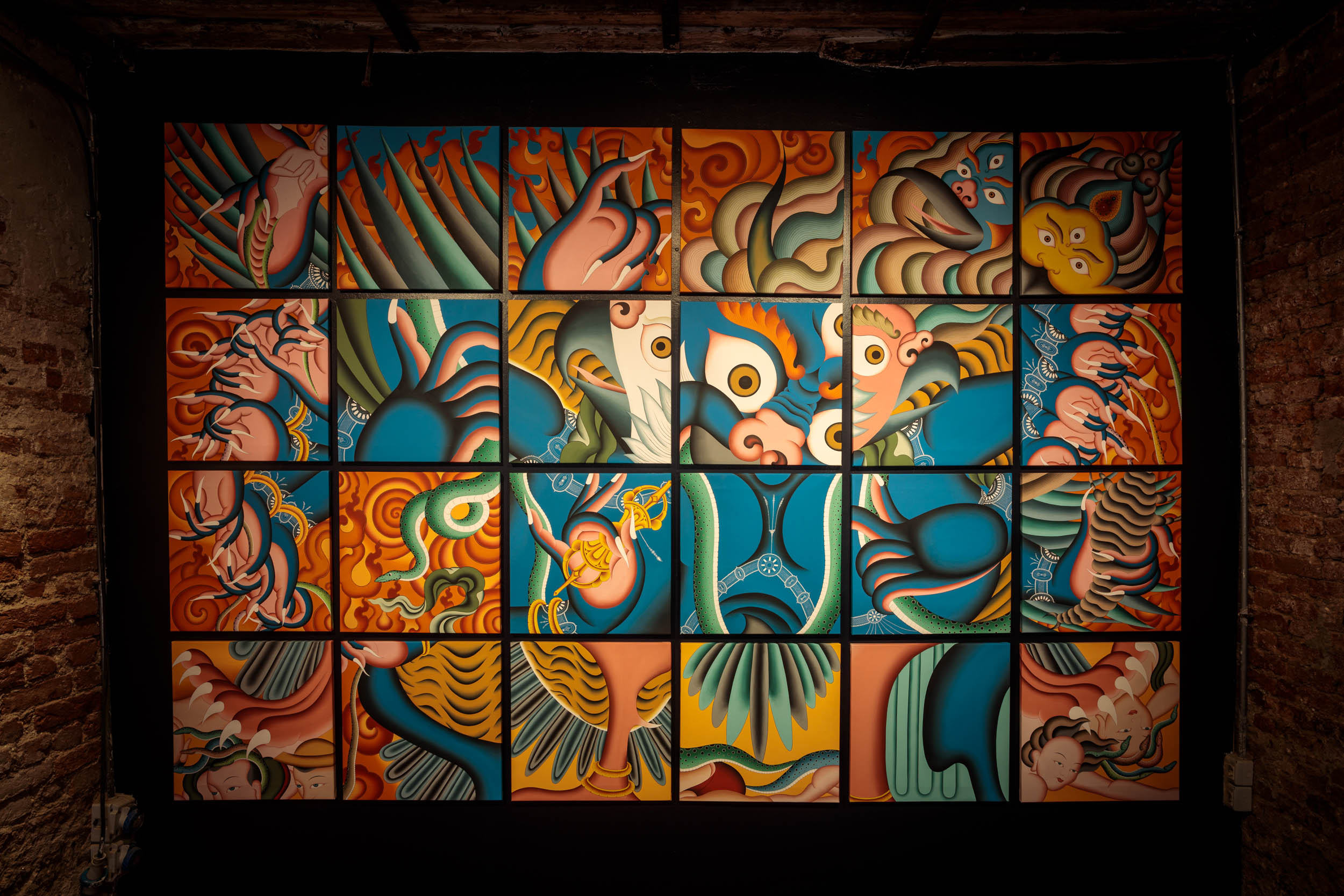 Muted Expressions is one of three components of the inaugural Nepal Pavilion at the 59th Venice Biennale this year. Further in is a loom installation Entangled Thread which weaves together the rich stories and languages of the artisans behind Nepali rugs and textiles. Then in the back is Views of Luxation: 24 canvases that together show a fragmented Garuda – a playful spin on iconography with frames that hold eyes, limbs, beaks, a vajra, all in a puzzling order.