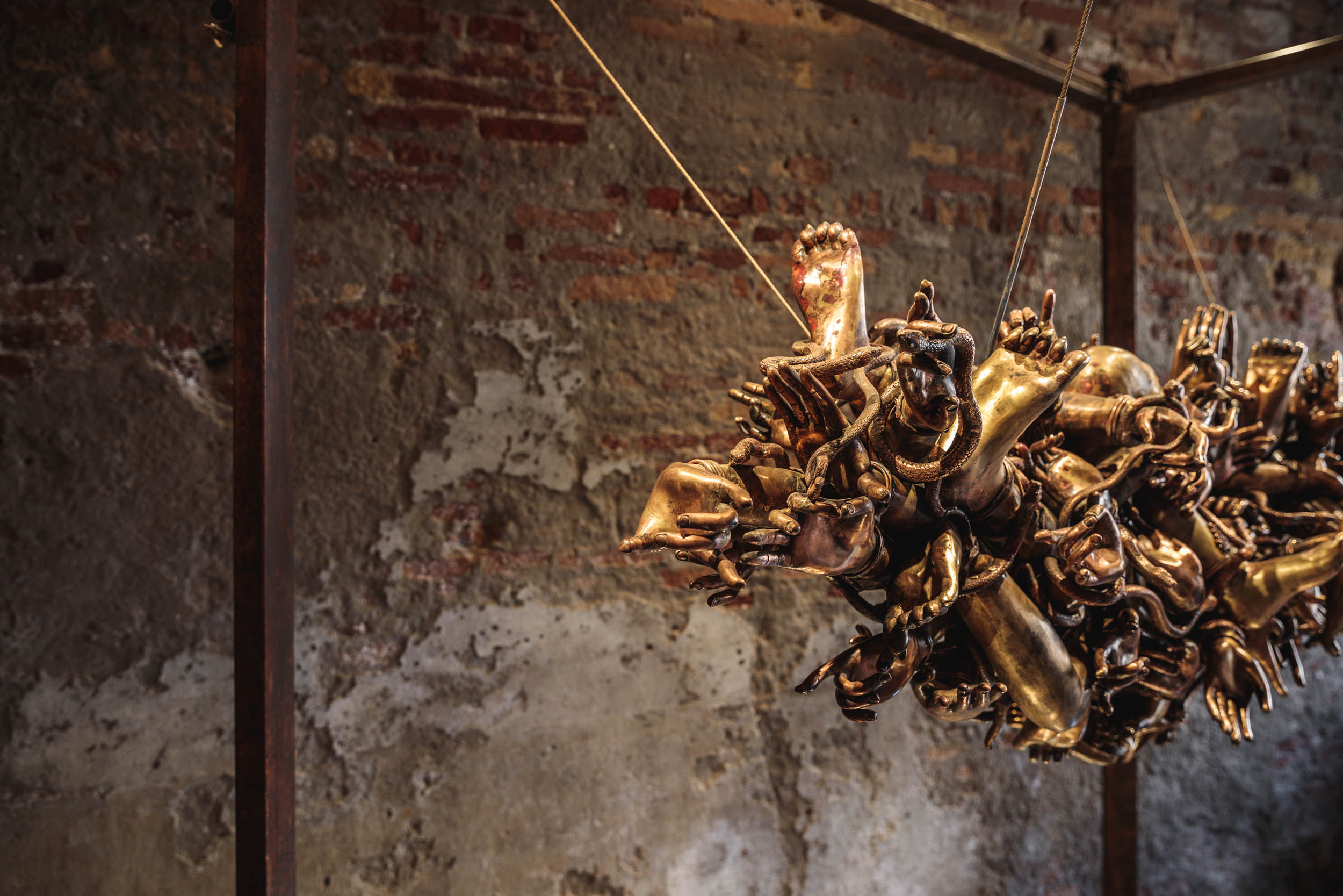 Through the windows of a traditional Venetian building, one catches a glint of bronze. Drawing closer, it begins to take shape: a dramatic knot of hands and feet, in various mudra, with coils curling around and through them. It floats in mid-air, like a yellowish-red mass of cloud – defying gravity, defying expectations.