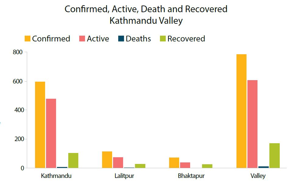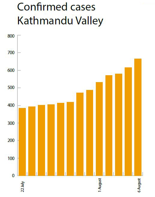 As of Thursday, Nepal has a total of 21,750 cases with 6,296 active. So far, 65 people have lost their lives, five of them on 6 August alone. Cases in Kathmandu Valley have reached 876, mostly in the capital city (see graphs). Eight people have been infected with coronavirus at the Ministry of Internal Affairs and Law and so has minister Gyanendra Kumar Yadav in Province 2.