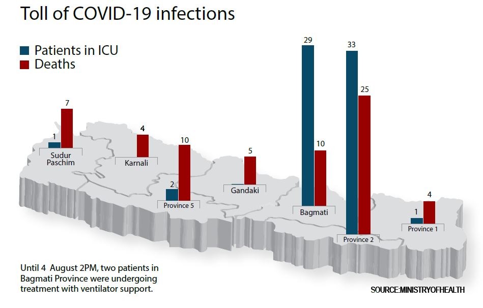 There are now 66 ICU cases across Nepal with 29 just in Bagmati Province (see map) where three patients are on ventilator support. Given the steep rise in symptomatic and severe COVID-19 cases, all 1,702 ICU beds nationwide and stock of 900 ventilators could be used up.
