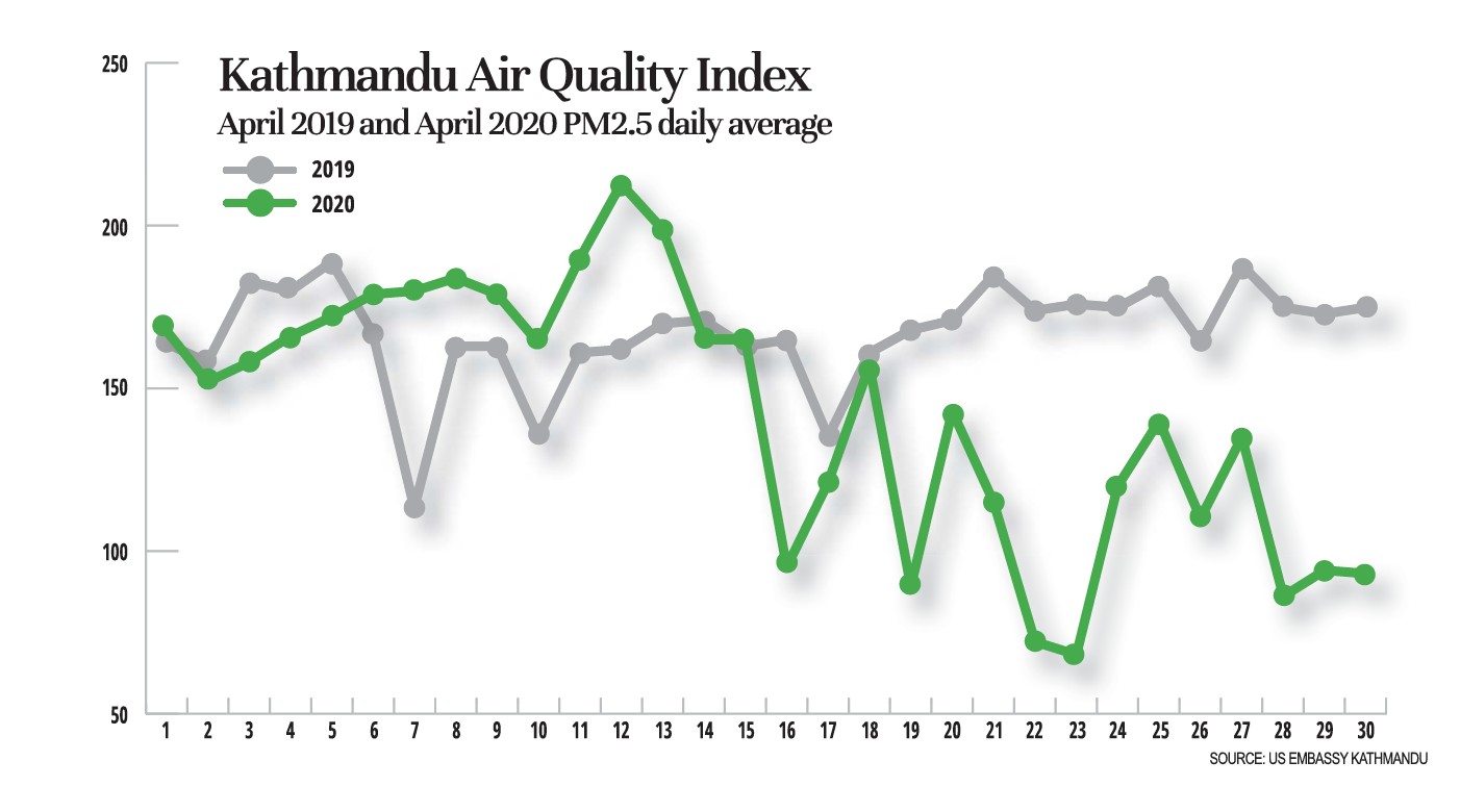 Air pollution data for Kathmandu and other cities in Nepal also indicate an average of 38% improvement in air quality because of restrictions in vehicular movement since the first lockdown went into effect on 24 March.