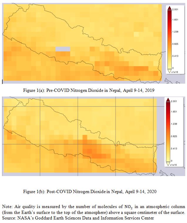 The air quality satellite image (see map) shows that the number of molecules of NO2 per cm2 was much higher in Kathmandu Valley in 9-14 April 2020 when compared to the same days in 2019.