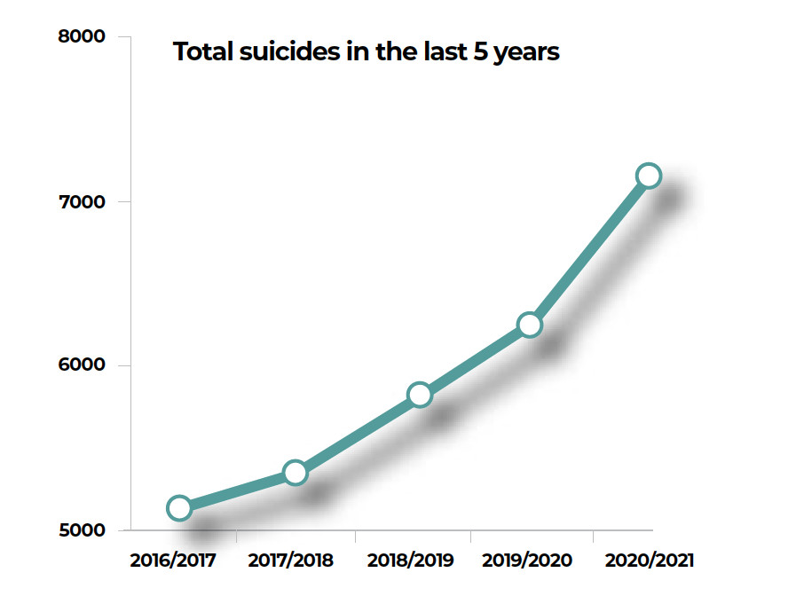 There has been a sharp rise in suicides in Nepal since the Covid-19 pandemic in March 2020 and subsequent lockdowns. Nepal Police data shows that in the last 12 months, there have been 7,141 reported deaths due to suicides nationwide, up from 6,252 the year before.