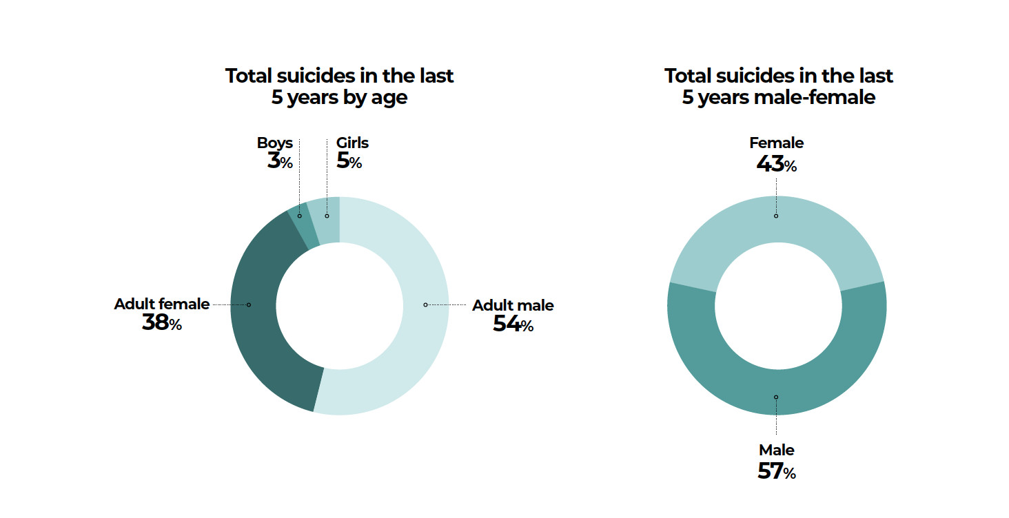 Suicide deaths are also disproportionately distributed across Nepal with Province 1 recording 65 deaths per 100,000 populations. Lumbini and Gandaki follow closely with 58 and 52 per 100,000 respectively. Traditionally neglected by the state and economically disadvantaged Karnali, Far West and Province 2 regions have lower suicide rates.