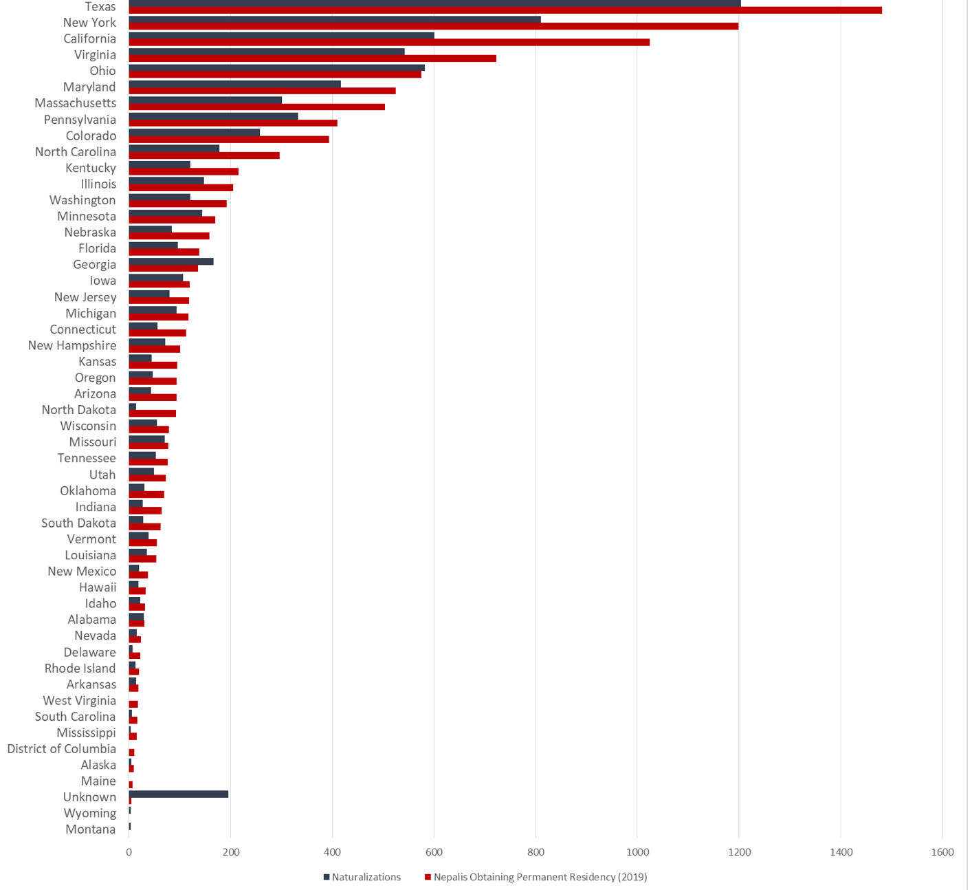Last year, 7,409 Nepalis got naturalised in the US whereas 10,201 received permanent residency. The top five states hosting Nepalis are Texas, New York, California, Virginia and Ohio (see figures below). In addition, a significant number of Nepalis also take circuitous paths to reach the US when they do not have access to the legal routes like H1B and DV.