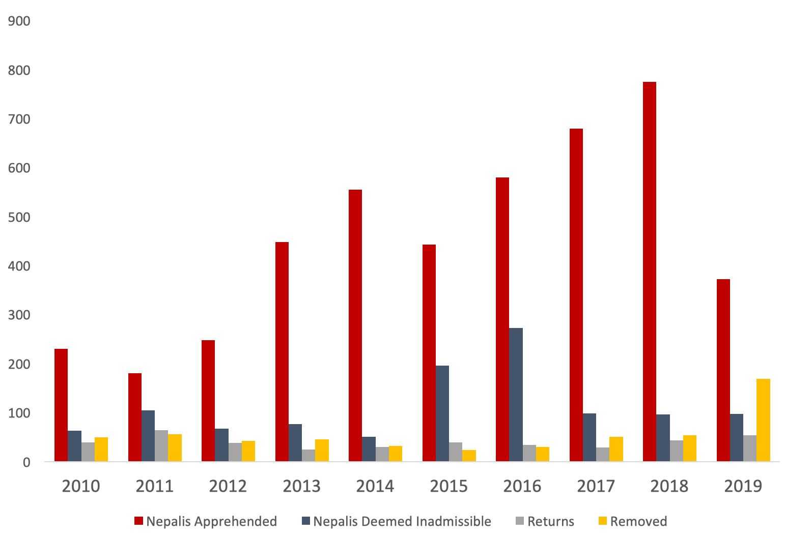 Between 2010-2019, there were 4,511unauthorised Nepalis who have been apprehended. Of them, 1,124 were deemed inadmissible, while 951 Nepalis were returned or removed. Removals involve a formal court order, whereas returns are those who voluntarily go back to Nepal.
