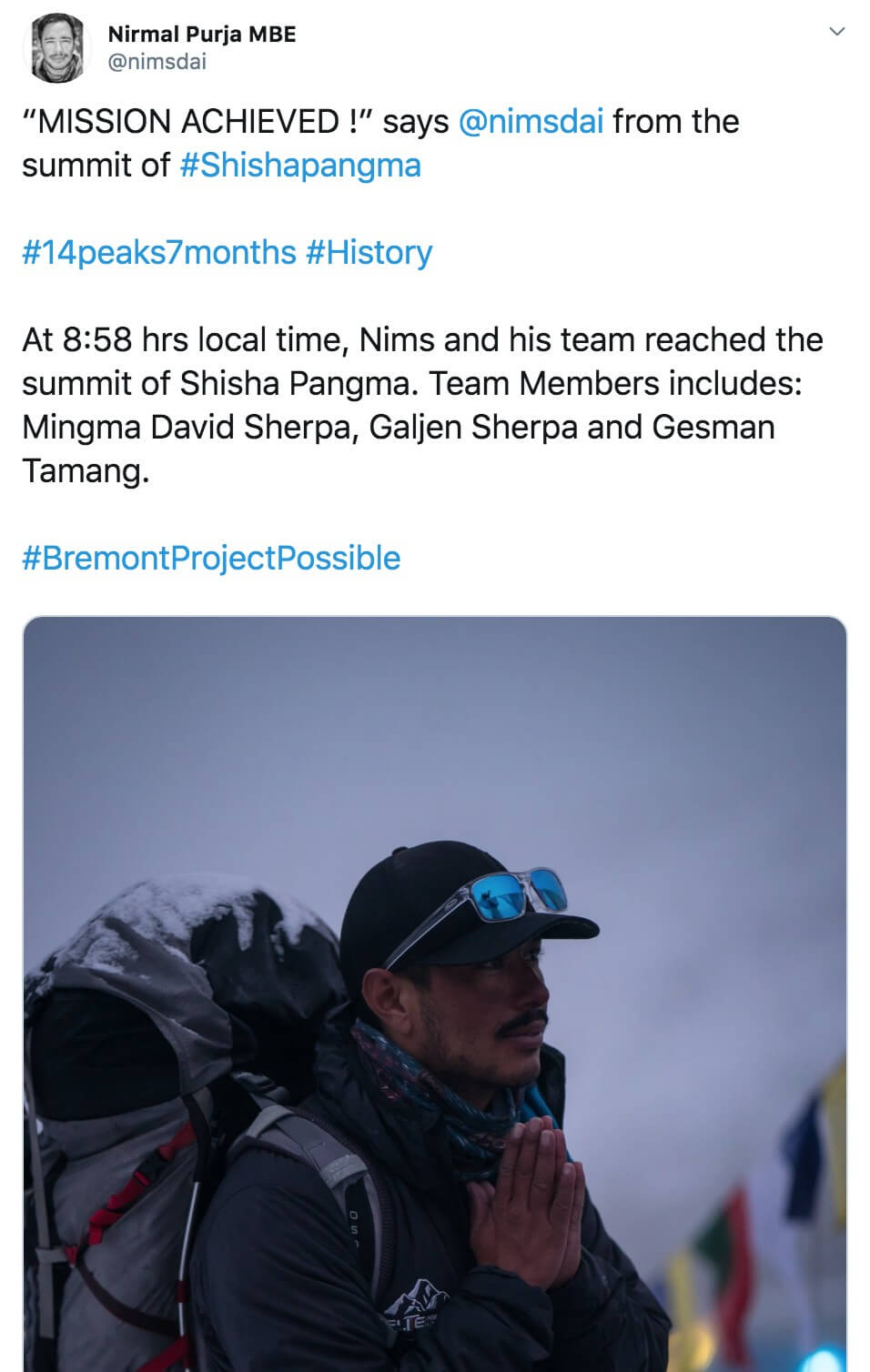 Originally from Myagdi district in Nepal, Purja joined the British Army Special Forces in 2003, the first Gurkha to do so. But climbing mountains was more important to him than a well-paying job, so he quit in March 2019 to begin his climbs.