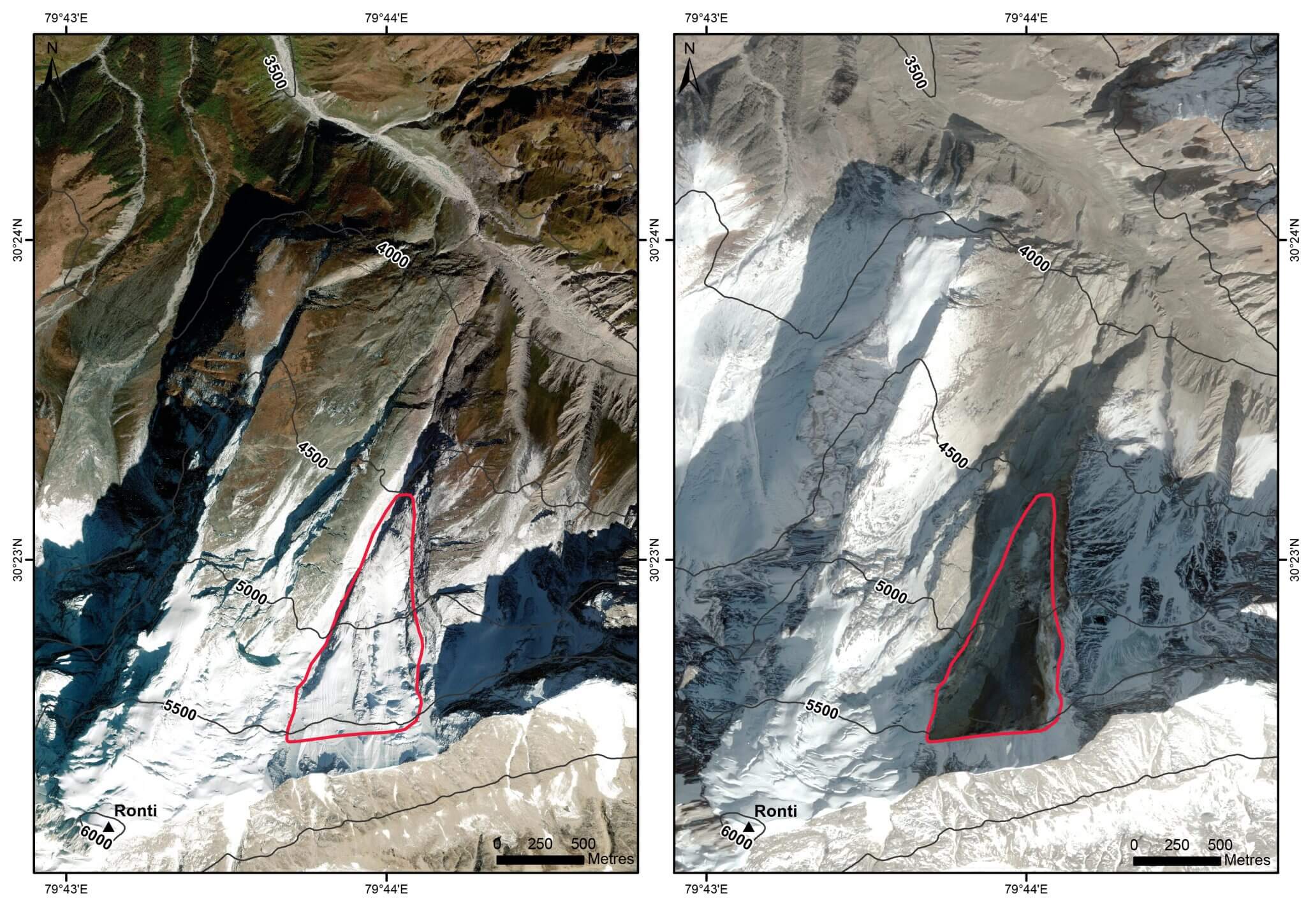 Scientists have concluded that a 500m wide section of the face of Ronti Peak broke off at 10:30am on 7 February at an elevation of 5,500m and fell with tremendous force on the glacier below. The kinetic energy of an estimated 22 million cubic metres of falling rock also melted ice deposits from a previous avalanche in 2016.