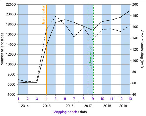 After analysing remote sensing data, the researchers conclude that although the number of landslides had started falling after 2015, there has been an uptick since 2017 possibly due to the proliferation of rural road construction around the time of the elections. (See graph, above.)
