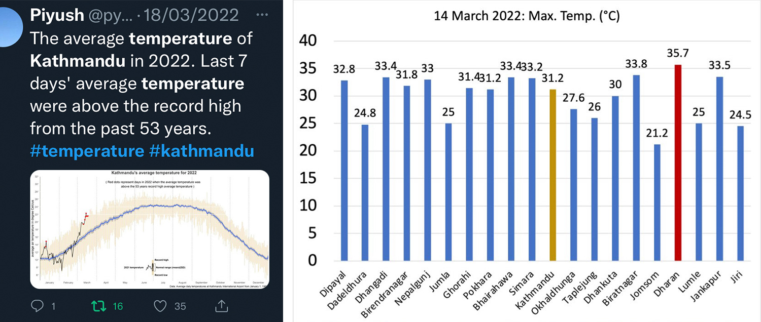After sweltering through record March heat, Kathmandu’s average temperature this week was at a 53-year record. Dharan registered 35.7°C in mid-March, another record. People in Nepal’s Tarai are used to heat waves, but not in March and April.
