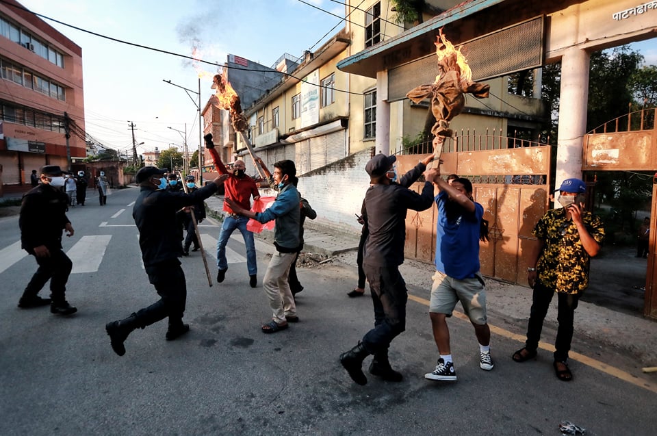 In the past two days, the prime minister and president have come under blistering attack from not just the opposition, but a cross section of civil society and media commentators. The student wing of the NC has been staging small protests in the capital despite the lockdown, burning Prime Minister Oli and President Bhandari in effigy.