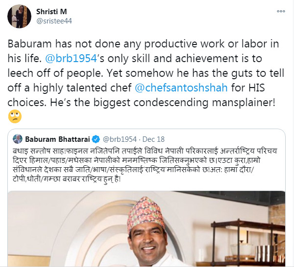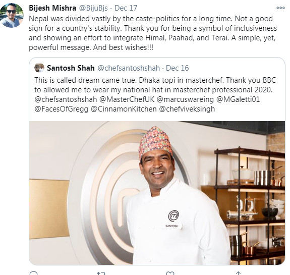 One of the first salvos was fired by none other than former Maoist ideologue and avid Tweeter Baburam Bhattarai, who posted: ‘बधाइ सन्तोष साह!फाइनल नजितेपनि तपाईॅले विविध नेपाली परिकारलाई अन्तर्राष्ट्रिय परिचय दिएर हिमाल/पहाड/मधेसका नेपालीको मनमष्तिष्क जितिसक्नु भएकोछ। एउटाकुरा, हाम्रो संविधानले देशका सबैजाति/भाषा/संस्कृतिलाई ’राष्ट्रिय’ मानिसकेकोछ! अत: हाम्रादौरा/टोपी,धोती/गम्छा बराबर’ राष्ट्रिय’ हुन्है!’