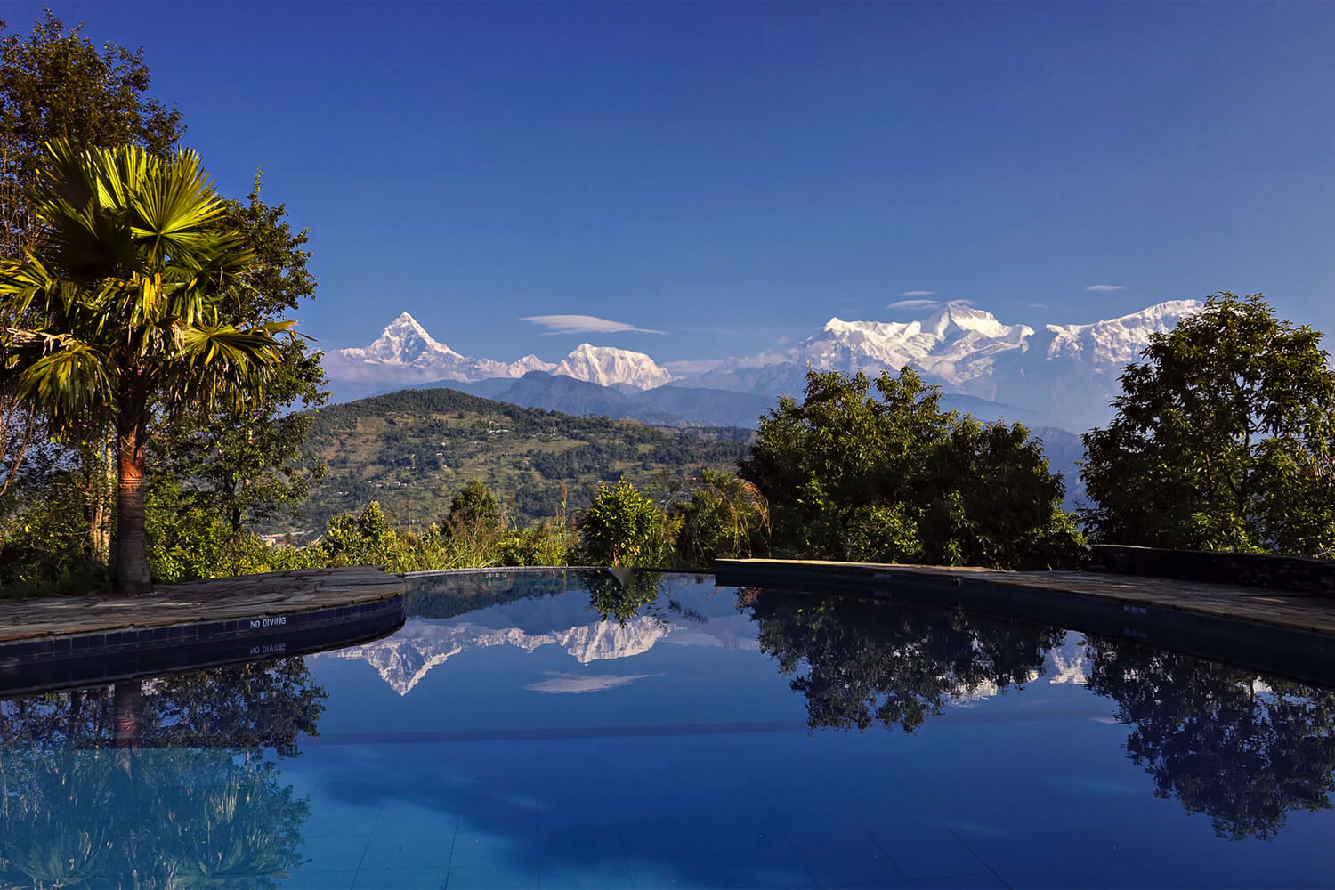 On that millennial eve, Pokhara Lodge had been operating for just over a year. The trees and wild landscaping had yet to mature around the honey-coloured stone bungalows, hand-cut from a local quarry, clustered like a local village adjacent to our community forest neighbours. The swimming pool bamboos were still in their infancy, but the peaks were already mirrored in its shimmering blue surface on a breathless morning as eagles, vultures and kites wheeled overhead.