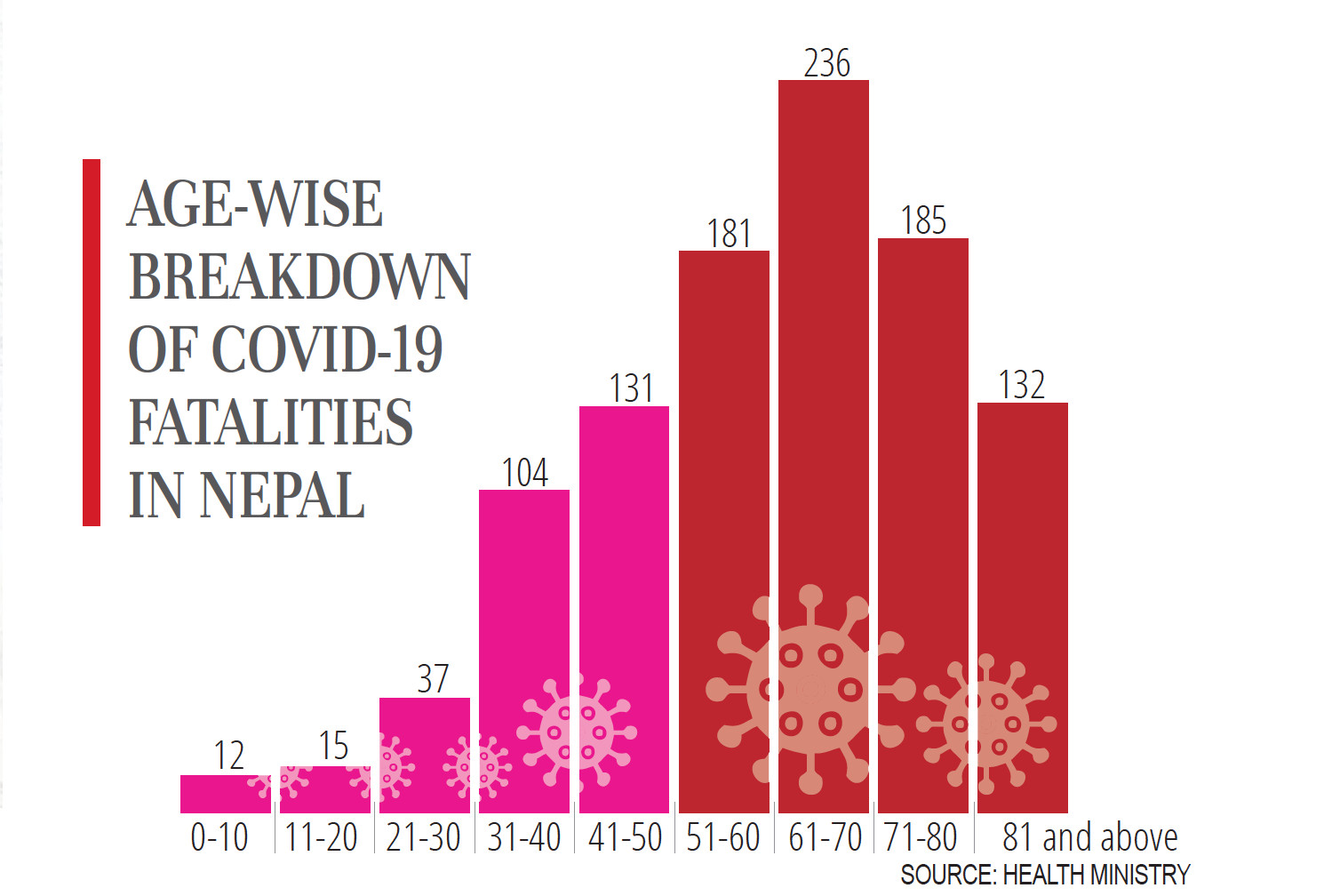 September-October saw a sharp rise in the fatality of people in their seventies and above from Covid-19, even though infection rate is much higher in the 21-50 age group. On 31 October when Nepal registered 23 deaths a day, 13 of the fatalities were above 70, and 20 of them were aged between 60-70.