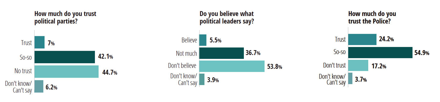 The national Parliament also suffers a trust deficit, with more than a quarter of respondents saying they lack faith in the federal legislature. Only 7% said they trusted Parliament, while 43% were ambivalent.