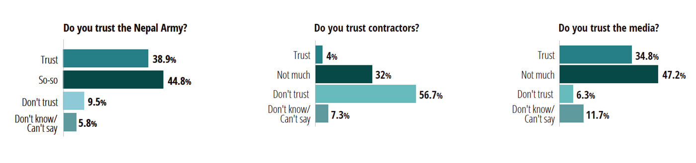 In a wakeup call for journalists, a full 47.2% said they did not have much faith in the media. Politically-slanted content and the over-commercialisation of the media appear to be behind this. Lawyers fared even worse, with 63% saying they don’t trust them much. But the most untrustworthy profession seems to be contractors, with 57% saying they do not trust them. This figure is even higher for Karnali Province, which is plagued by delays in infrastructure projects.