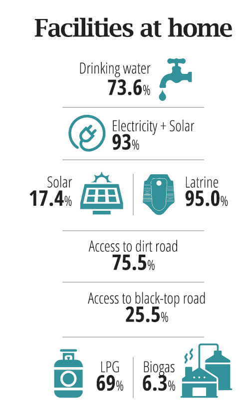 The most encouraging sign is that the government's emphasis over the past decades on rural electrification, water and sanitation appears to have yielded results. Of the 4,129 individuals surveyed in 42 districts, 94% had electricity, 95% had latrines and 74% (which is still low) had a drinking water supply. However, it is a sign of development that 75% now live near some kind of road, while 70% of Nepalis seem to use LPG for cooking.