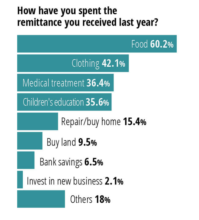 Asked to name the top three items that they spend remittance money on, 60% say they use it to buy food, 42% for clothing, 36% for medical treatment and 35% for children’s education. Some 10% used earnings to buy land, while only 6.5% saved it in a bank.