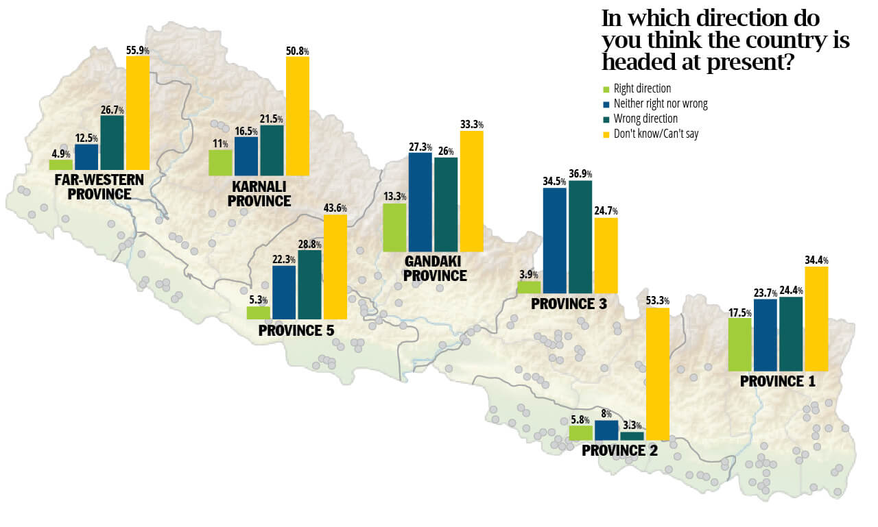 The highest percentage of those who think the country is headed in the wrong direction is in Province 3 (34%), while 4.9% of respondents in Far-Western Province say Nepal is on the right track.
