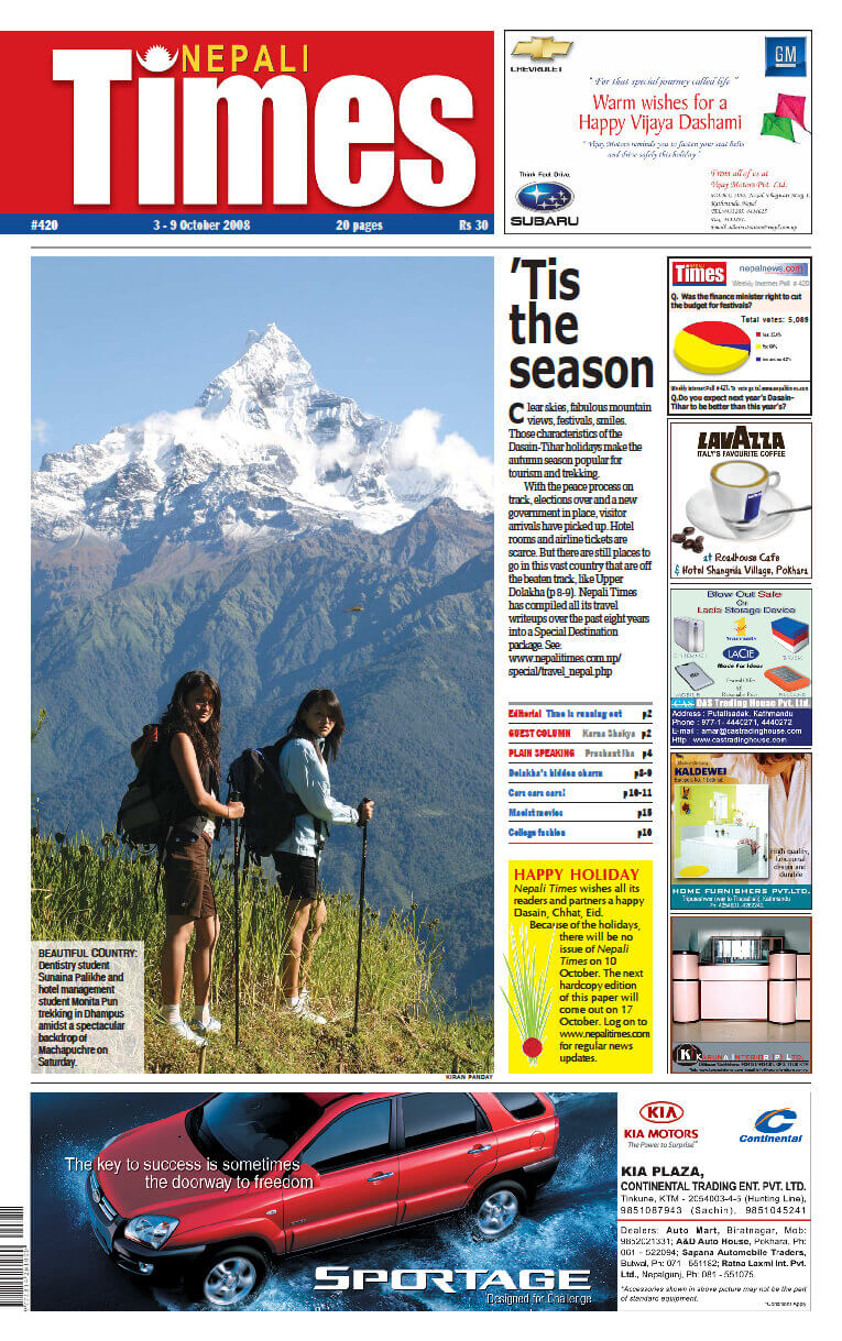 The front page of Nepali Times ten years ago (#419) 26 September – 2 October, 2018 covered the visit by Prime Minister Pushpa Kamal Dahal to New York for the UN General Assembly, and attendance at a reception by US President George W Bush. The editorial cited Dahal’s promise to generate 10,000MW of power in 10 years. It has been 10 years, and we still generate less than 1,000MW. Excerpt from the editorial: