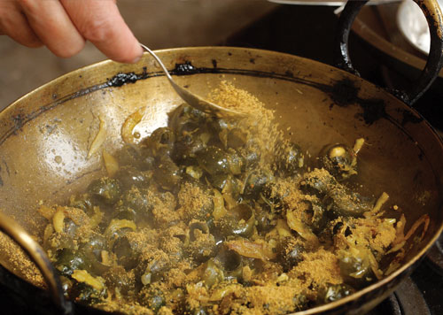Many in Nepal would look askance at this dish, but among the Tharus ghonghi snails are a delicacy. The indigenous Tharu people live along the southern plains, and despite different customs and costumes among sub-groups, they share a love for snails. In fact, the Tharu are fond of eating all aquatic life -- from fish and fresh-water shrimp to exotic tiny crabs and clams.