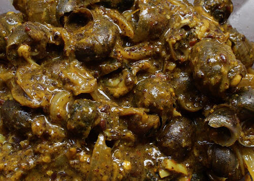 Snails are eaten as a hors d’oeuvre or with the main rice meal, and has a slightly slippery texture, tasting like creamy mushrooms. In general, Tharu cuisine is known to be very healthy as it includes fresh leafy greens which are boiled and not fried, very little oil is used.
