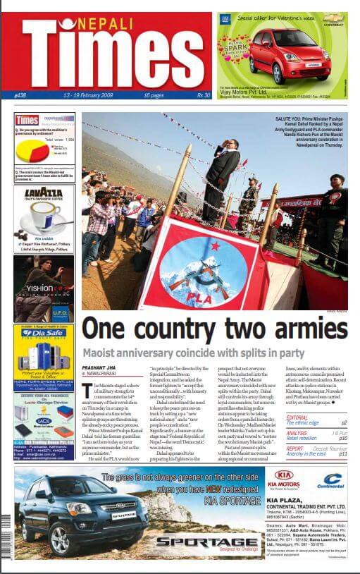 The southern plains and the eastern hills have been locked down now for weeks, but PM PKD has all the time in the world to helicopter over to Panchthar to attend his army’s anniversary. Defence Minister Cloudy was off in western Nepal attending a Tharu council. This whole week, the Baddie brass has been busy getting organised for the three-day gala war anniversary in Nawalparasi. All the UML members of the cabinet, including the Hydro Minister, will be out of action for another week because of the party convention in Butwal. And next week Nepal’s Other Army will be celebrating its own Army Day on Shivaratri.