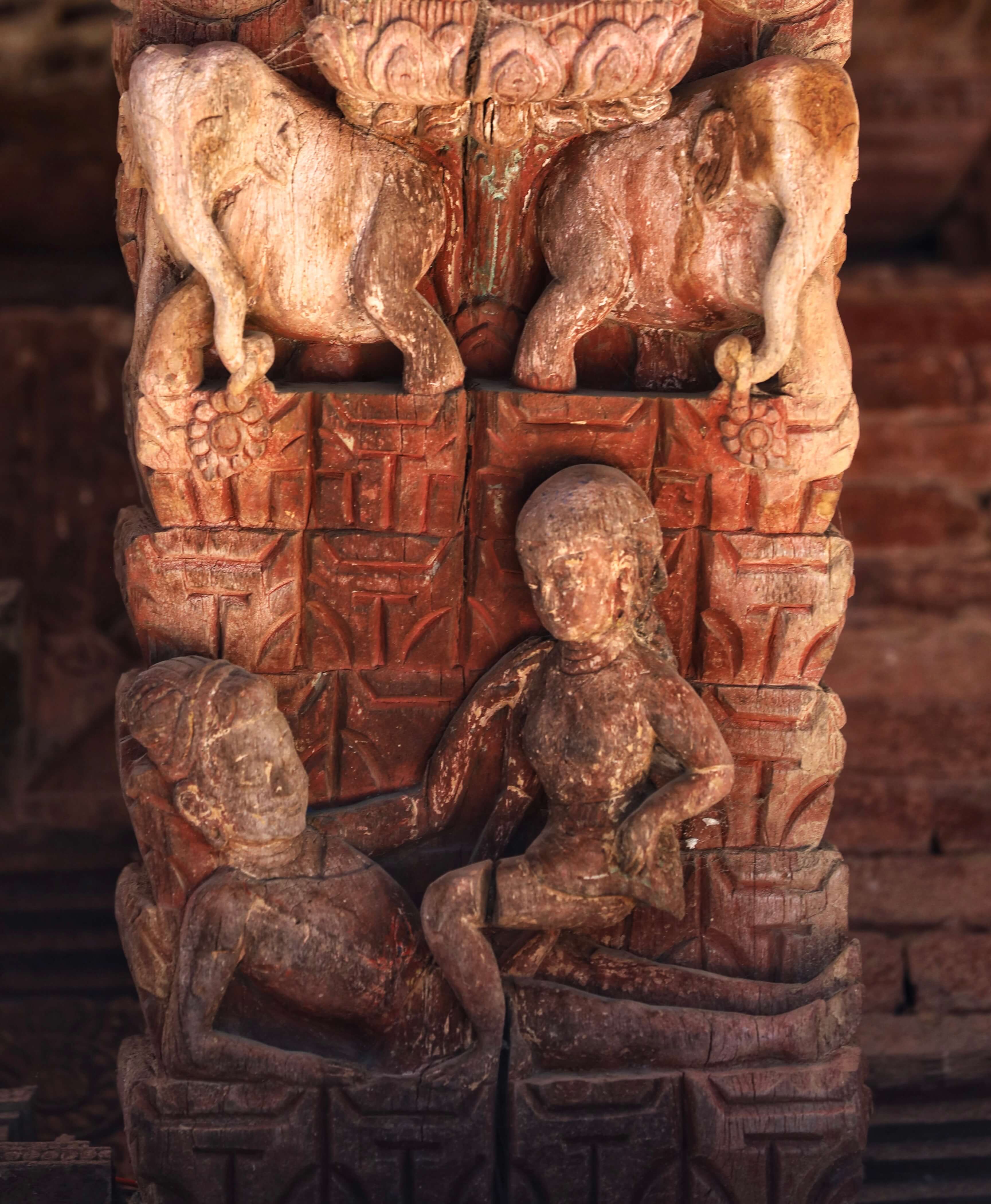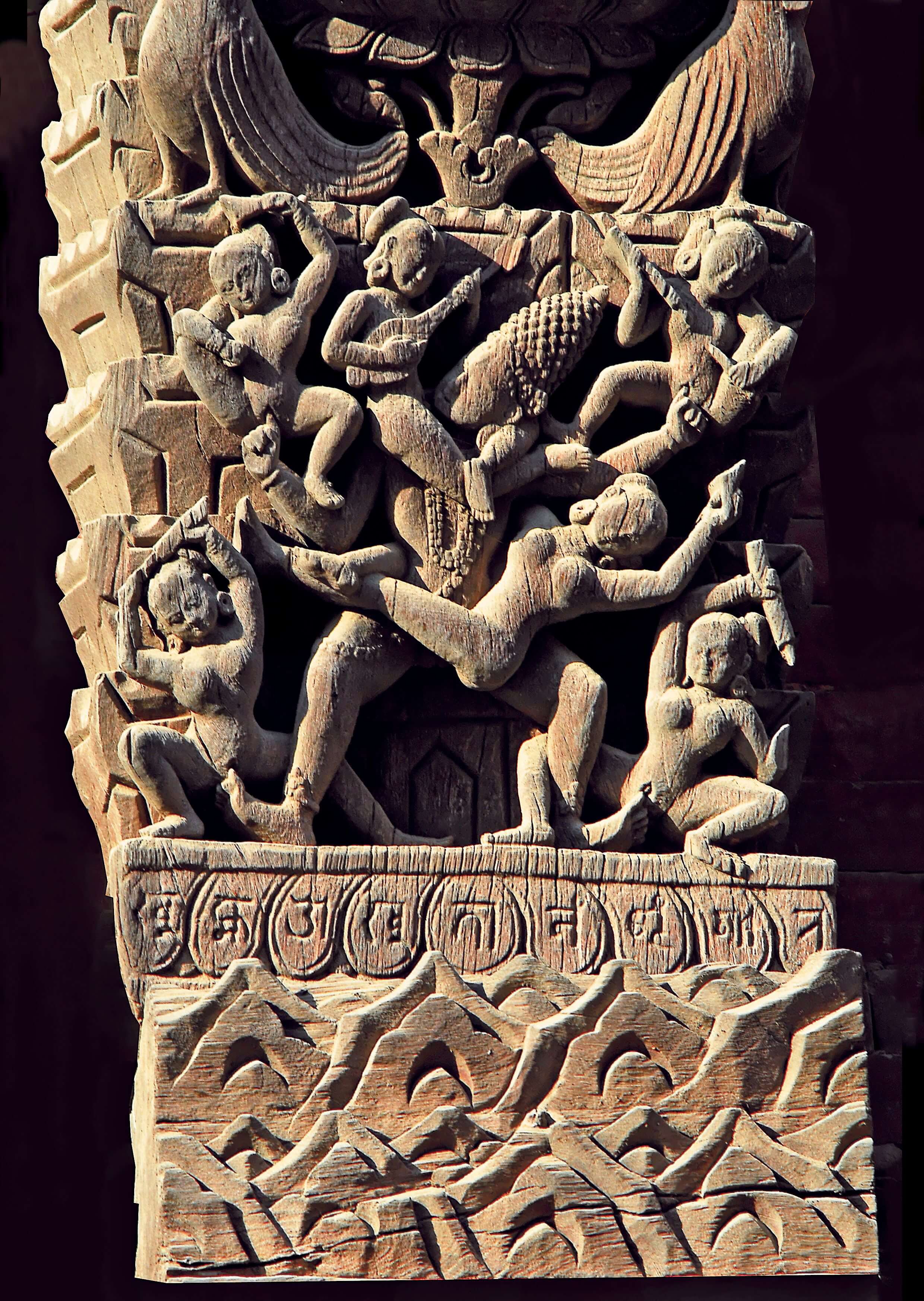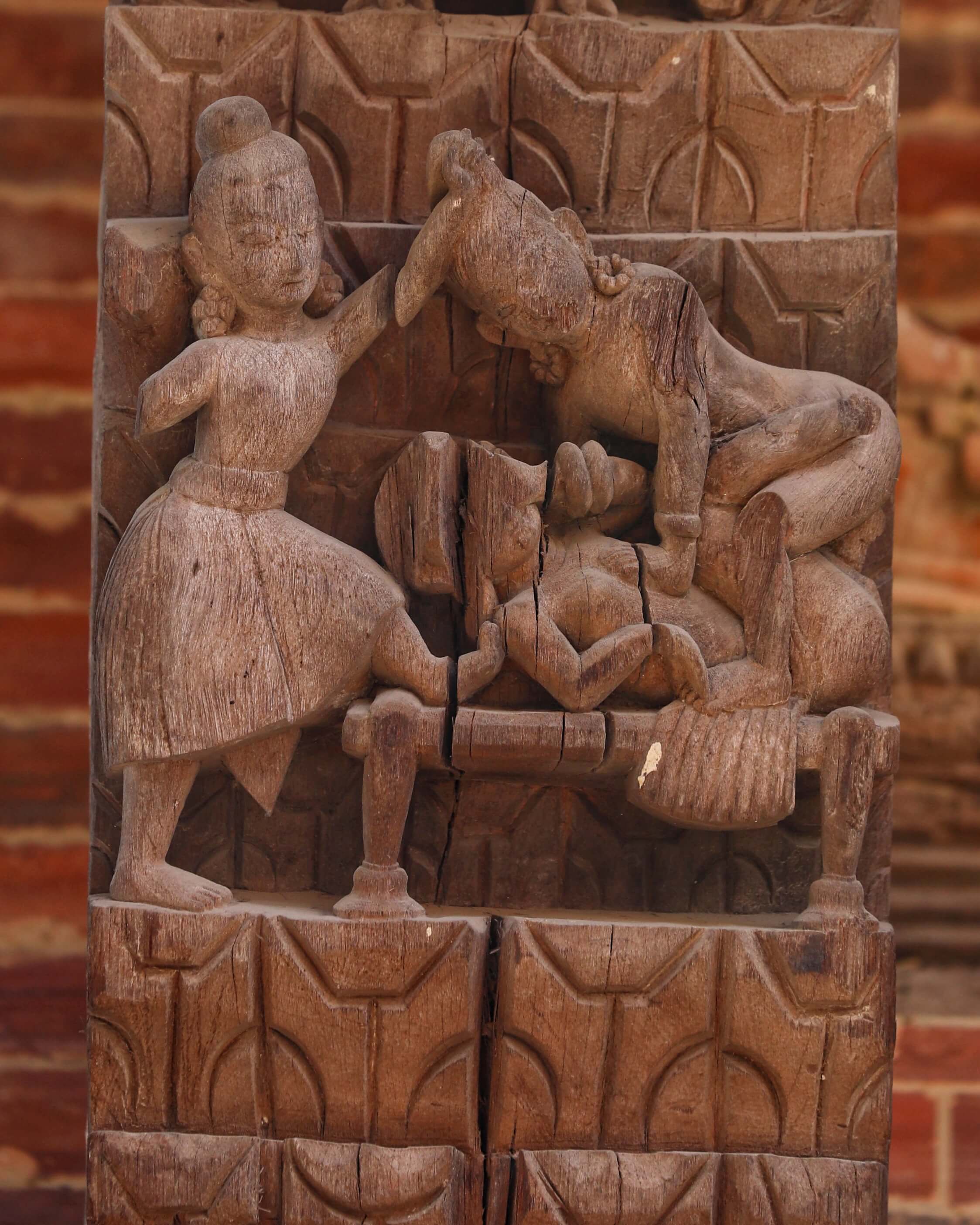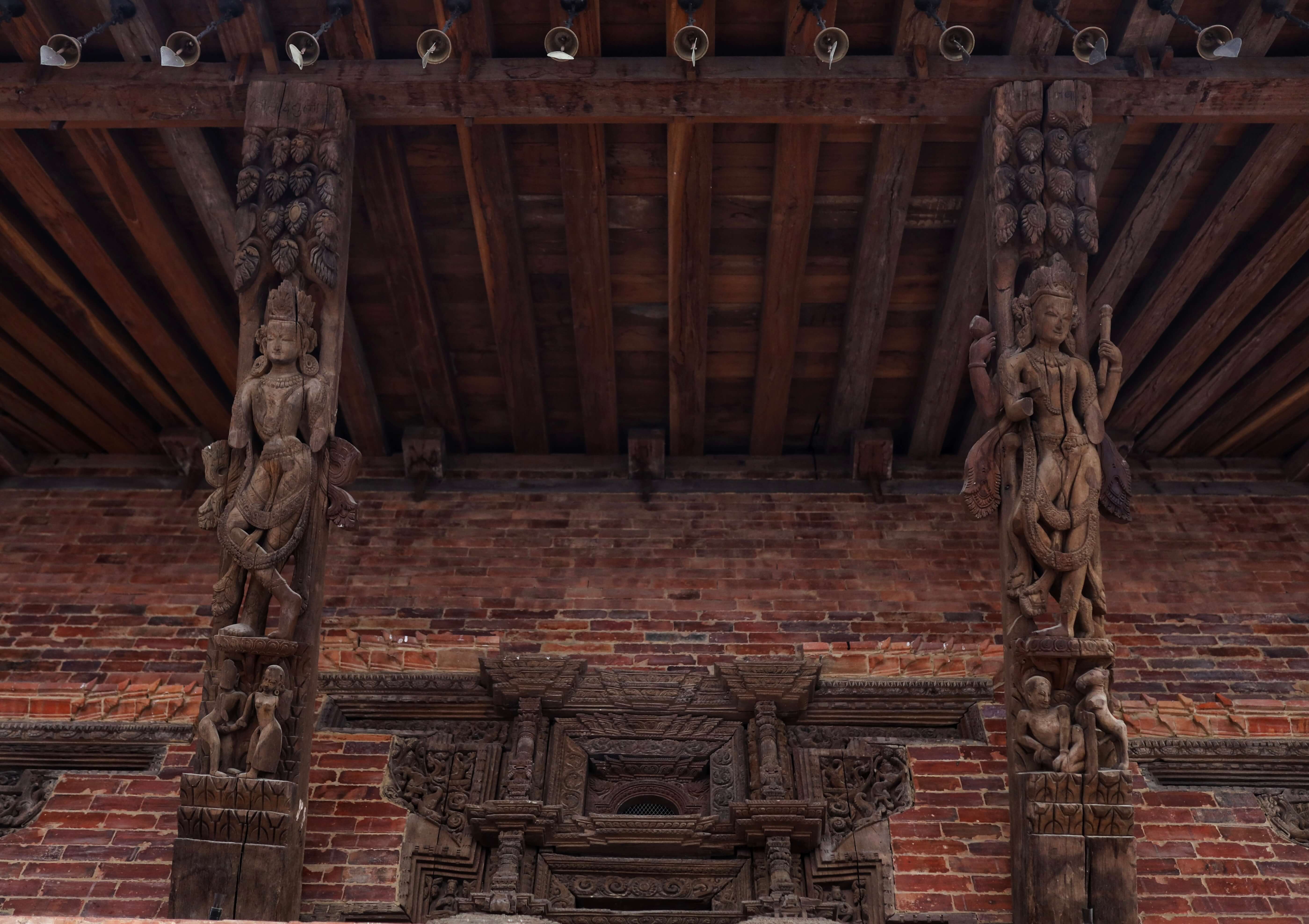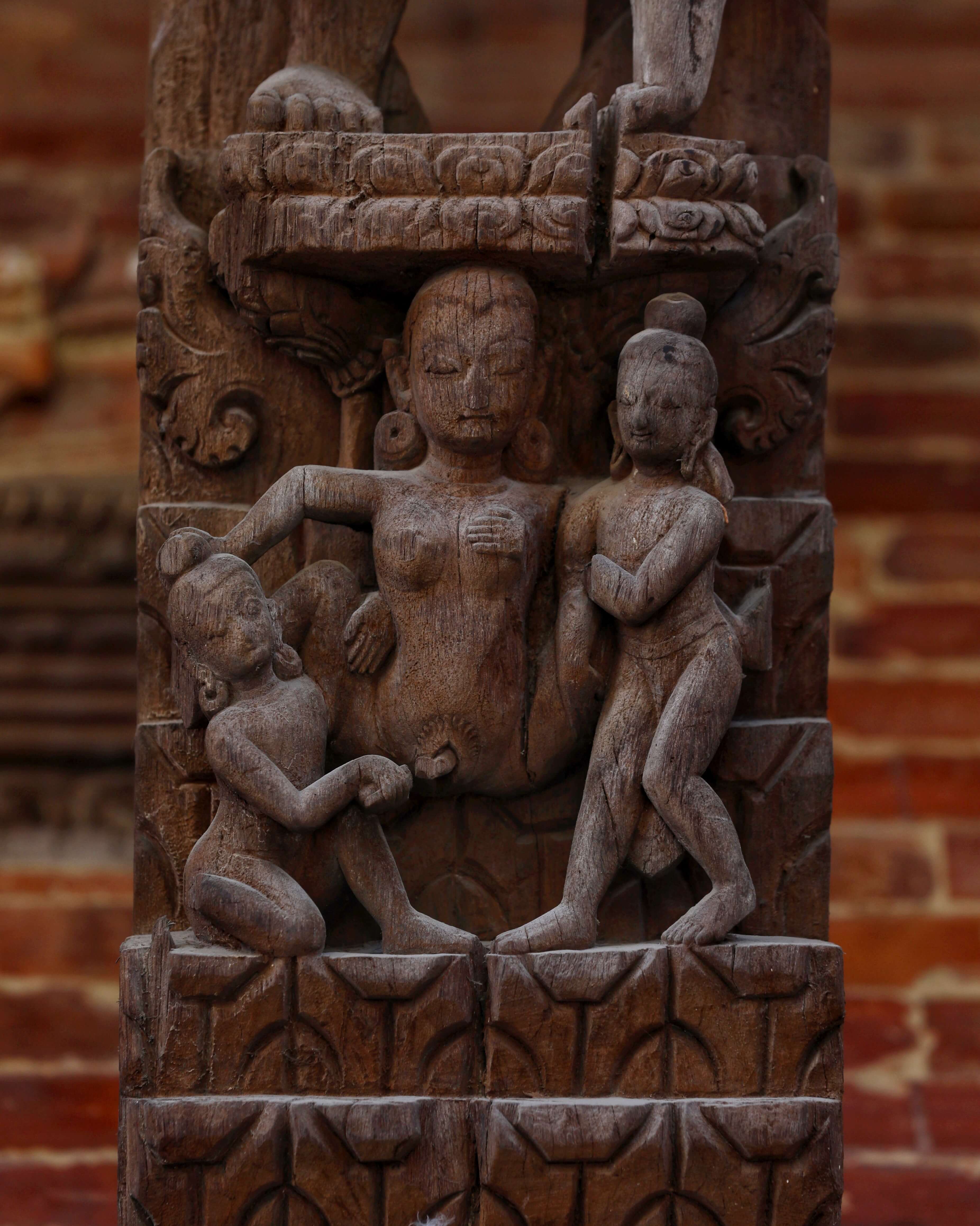 Until then the struts supporting the temple roofs in Nepal largely featured Salabhanjika motifs: standing full breasted slender figures, with wide hips and crossed legs, holding a tree branch with one hand.
