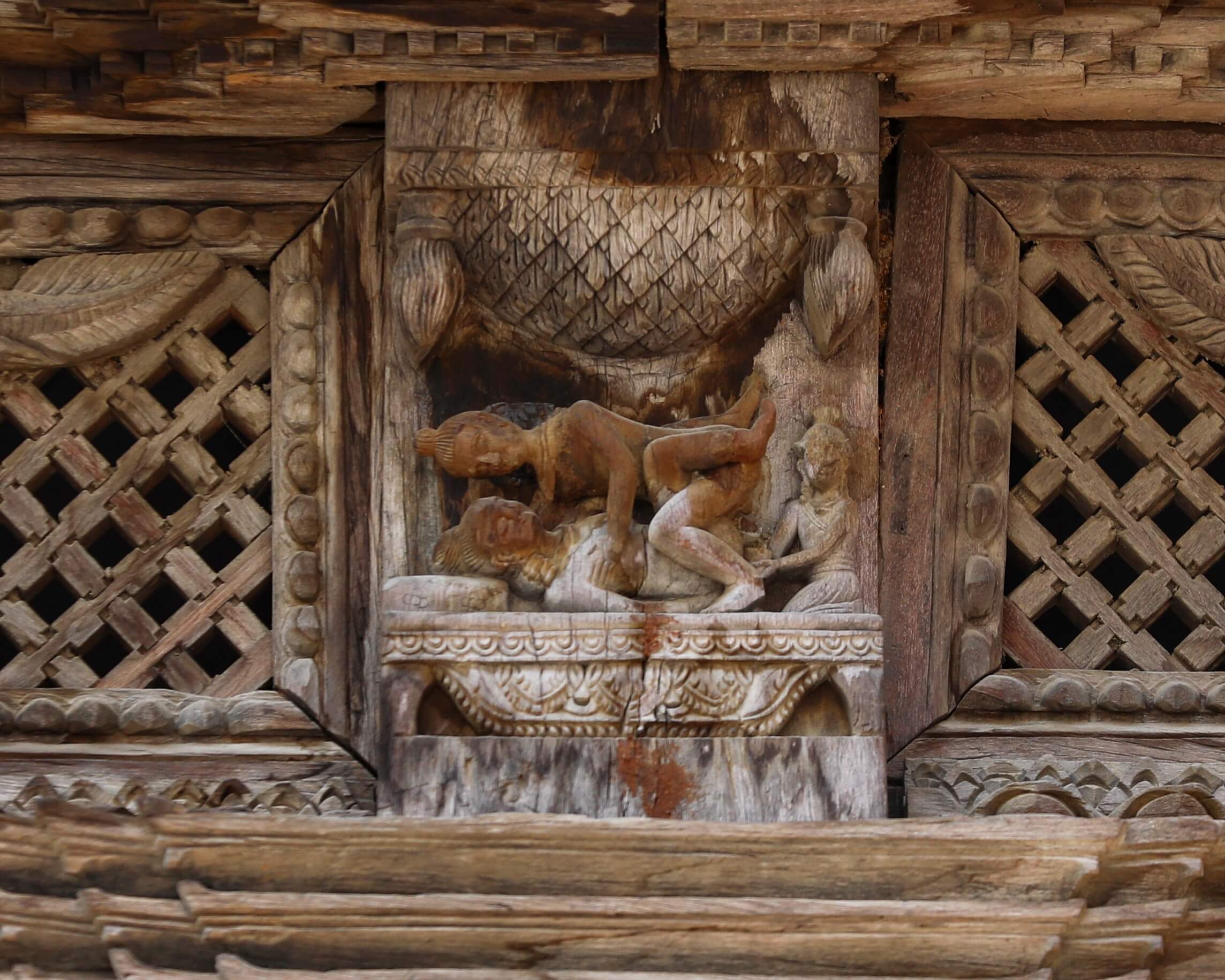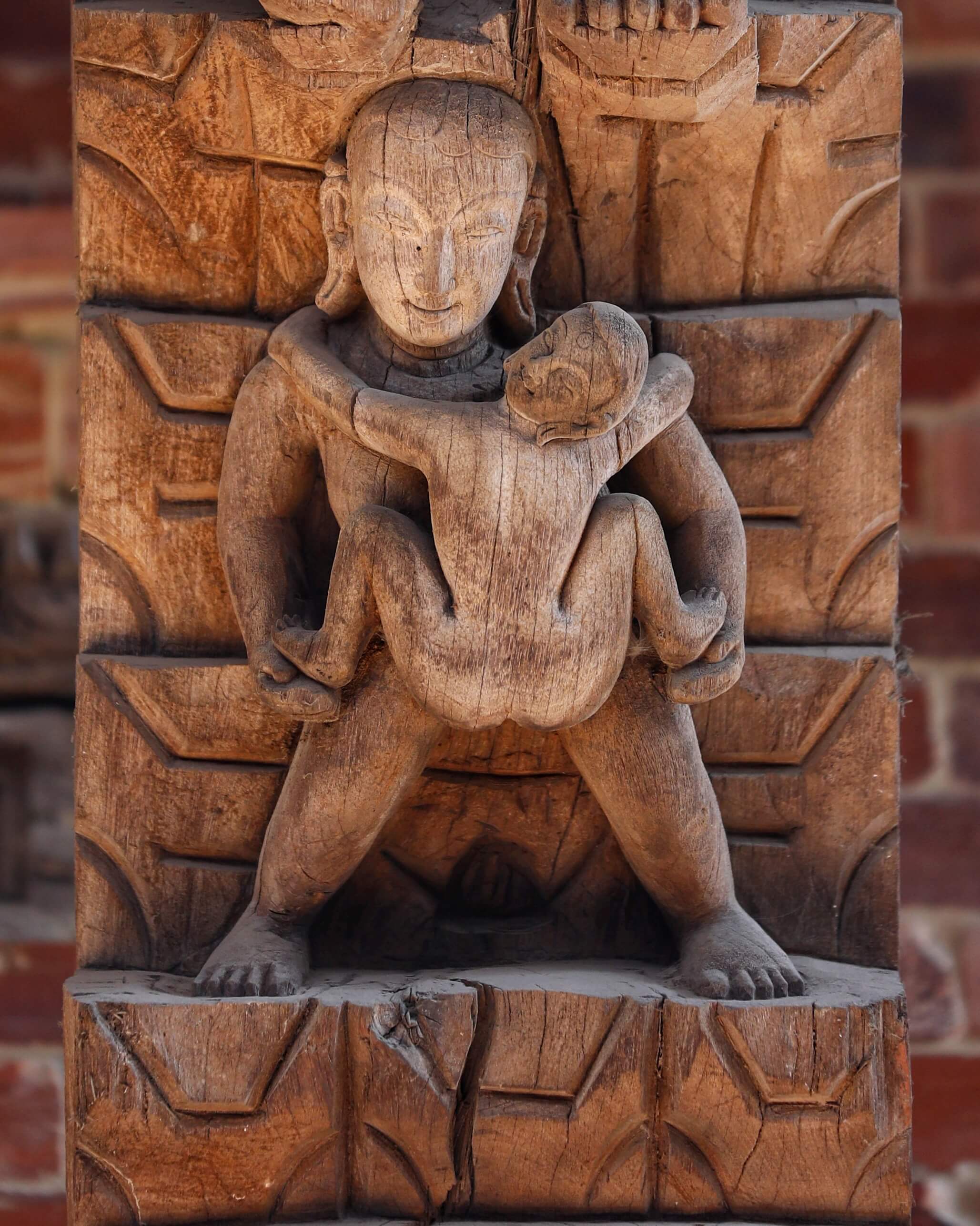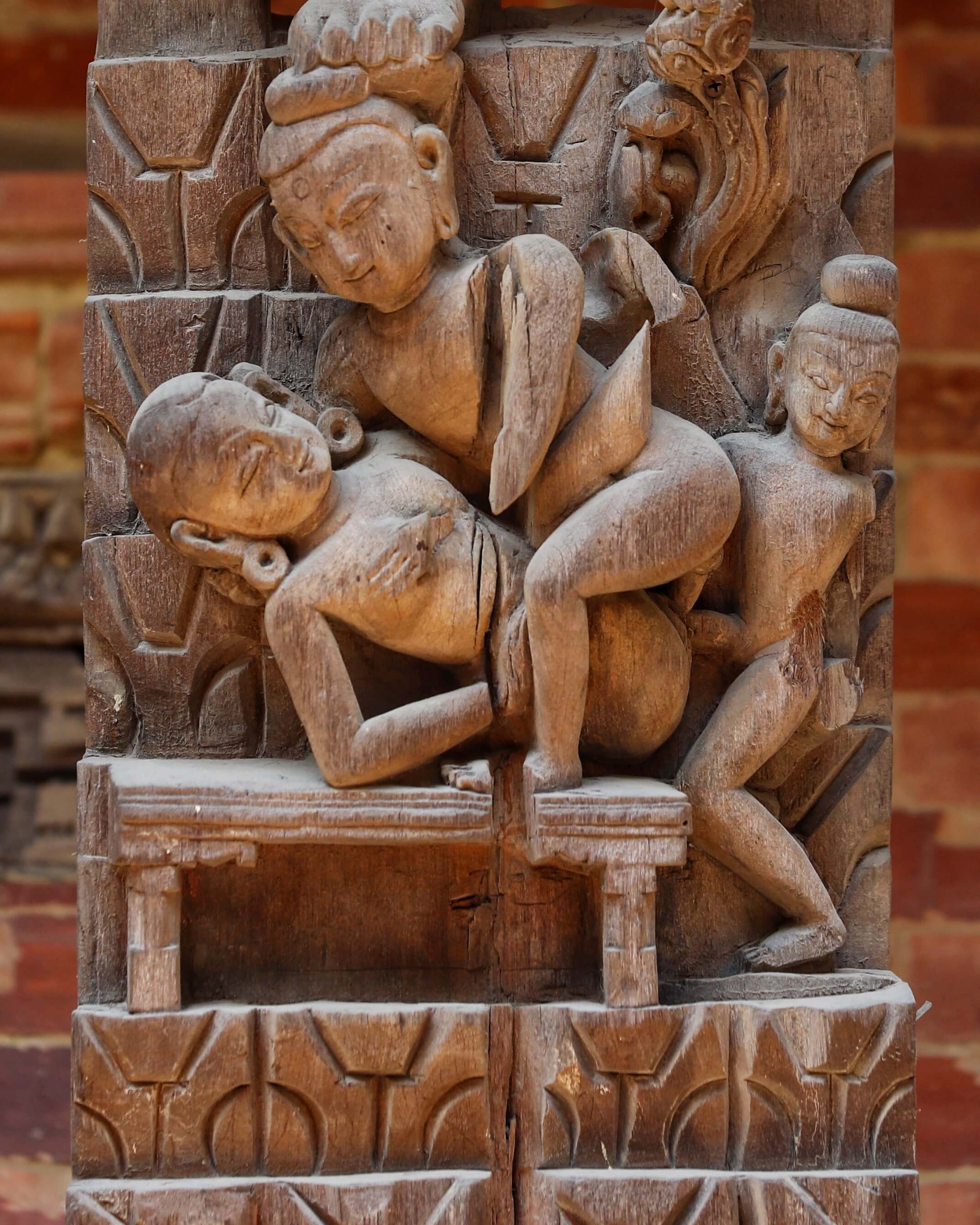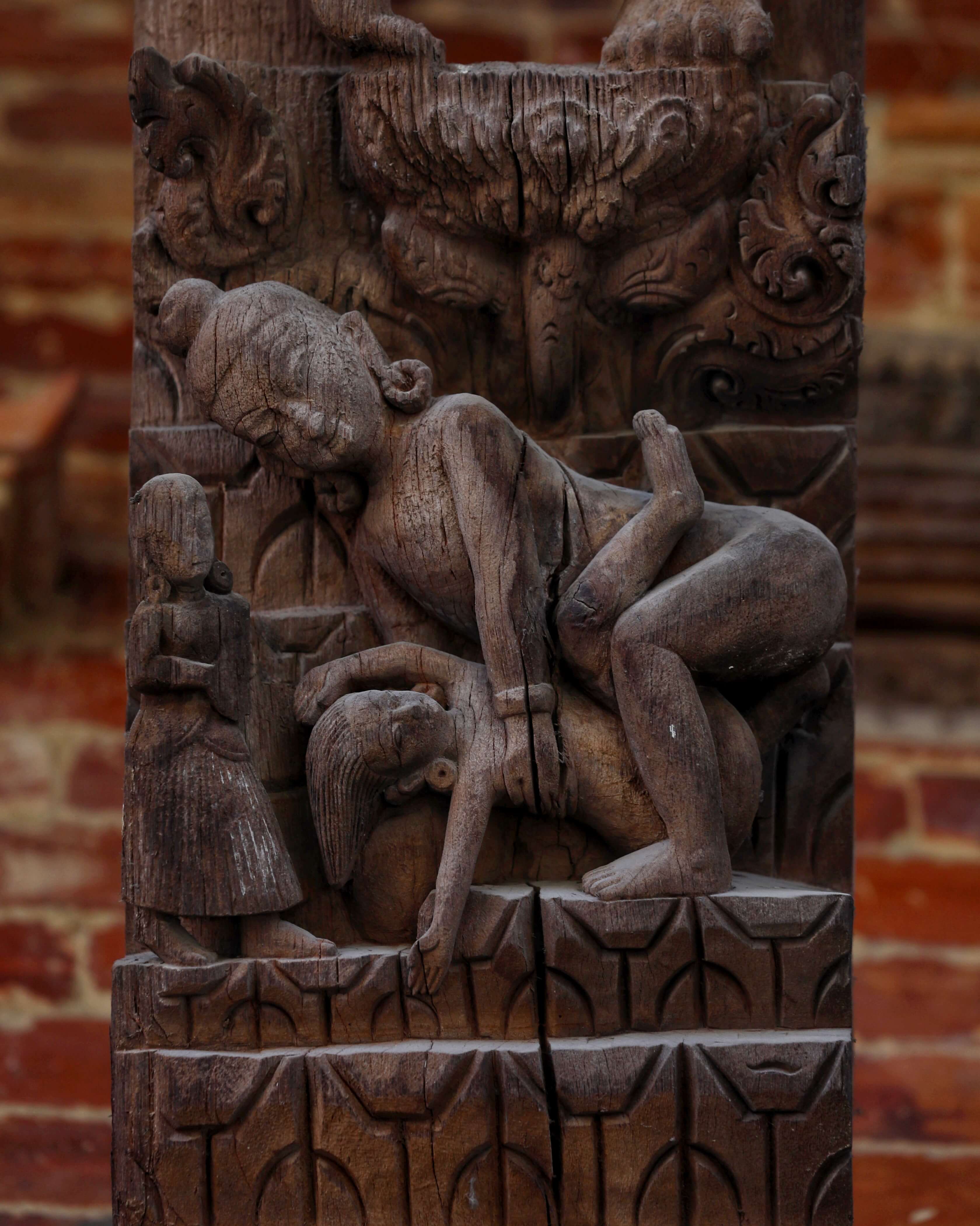Himalayan art scholar Mary Slusser called these revolutionary inclusions ‘blatant erotica’. The erotic art on temple struts (maithuna) flourished in the 16th Century, depicting couples interlocked and entwined in bold acrobatic positions that are immediately arresting to witness. Many struts had groups, sometimes with even animals participating.