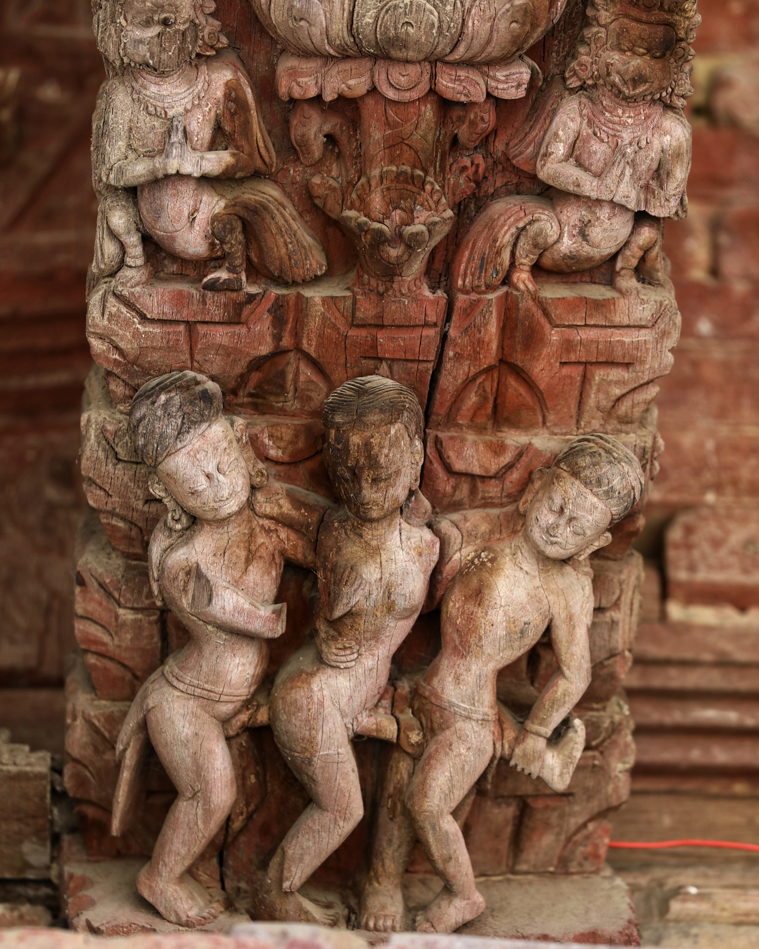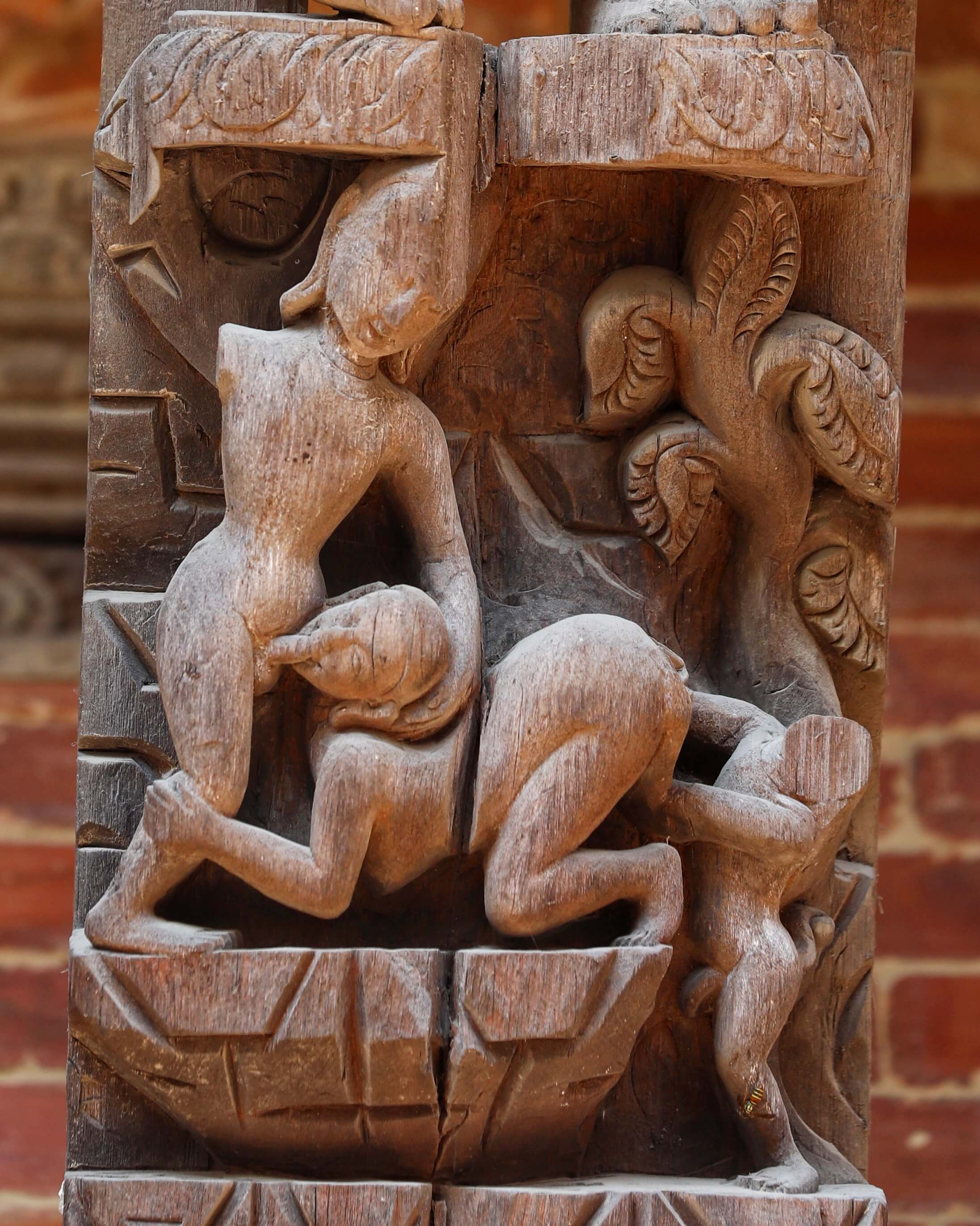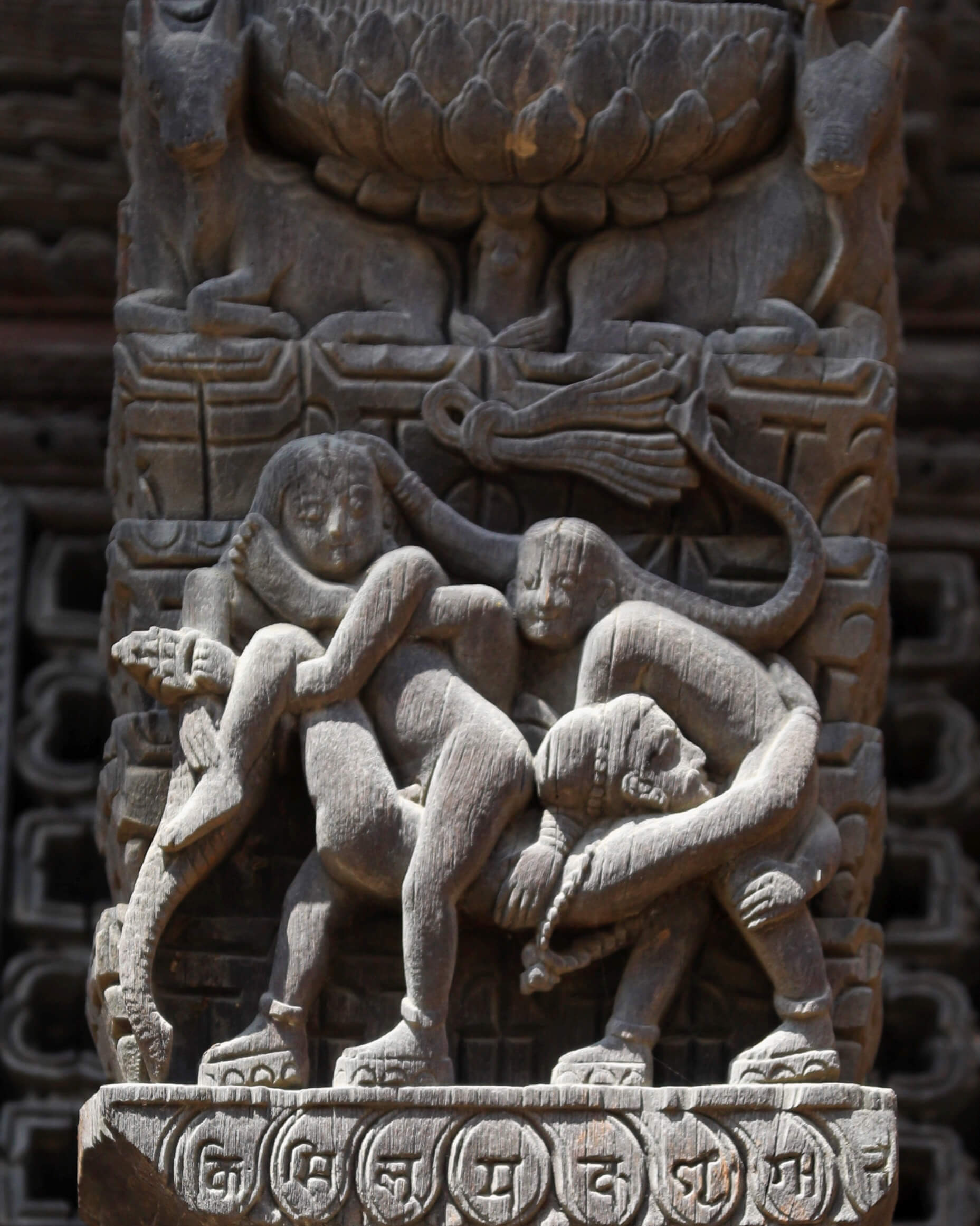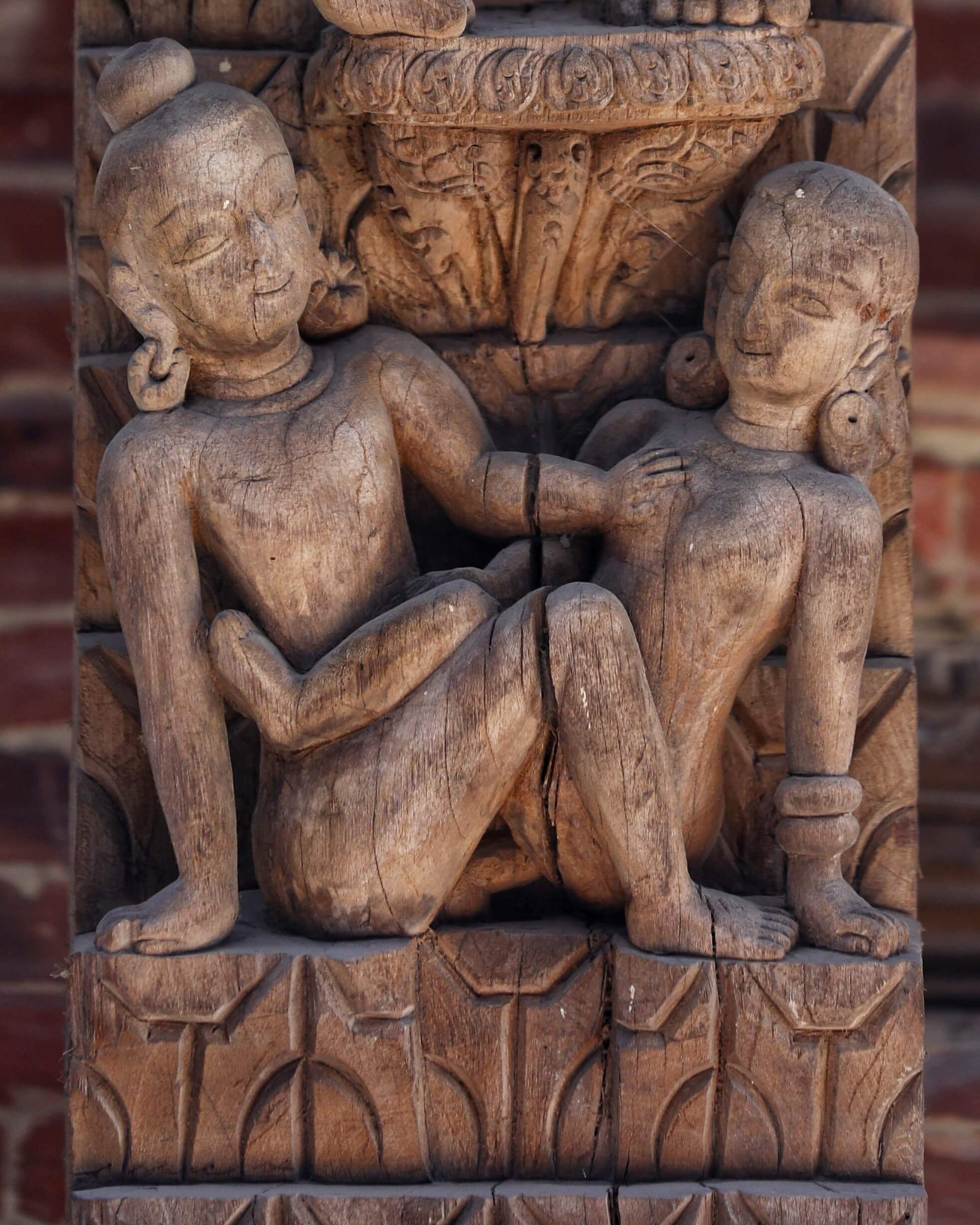 Himalayan art scholar Mary Slusser called these revolutionary inclusions ‘blatant erotica’. The erotic art on temple struts (maithuna) flourished in the 16th Century, depicting couples interlocked and entwined in bold acrobatic positions that are immediately arresting to witness. Many struts had groups, sometimes with even animals participating.