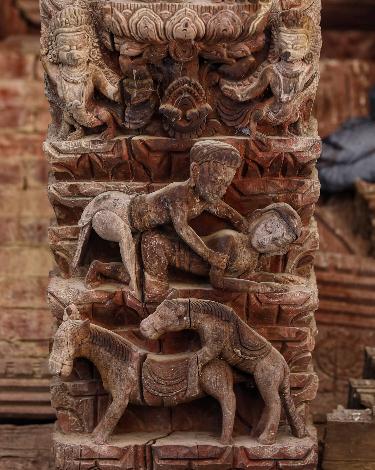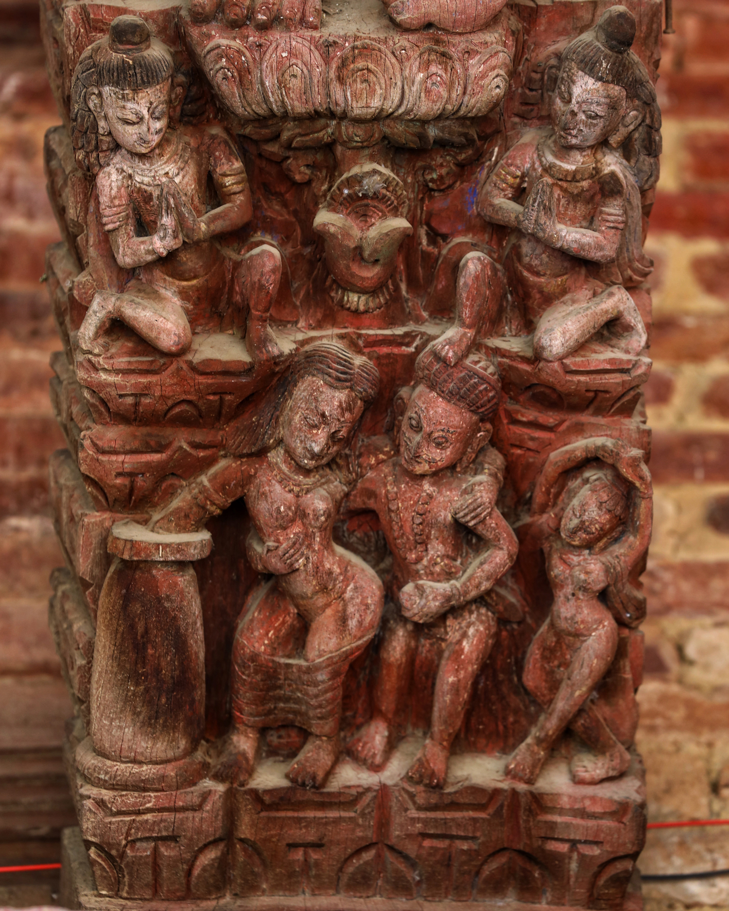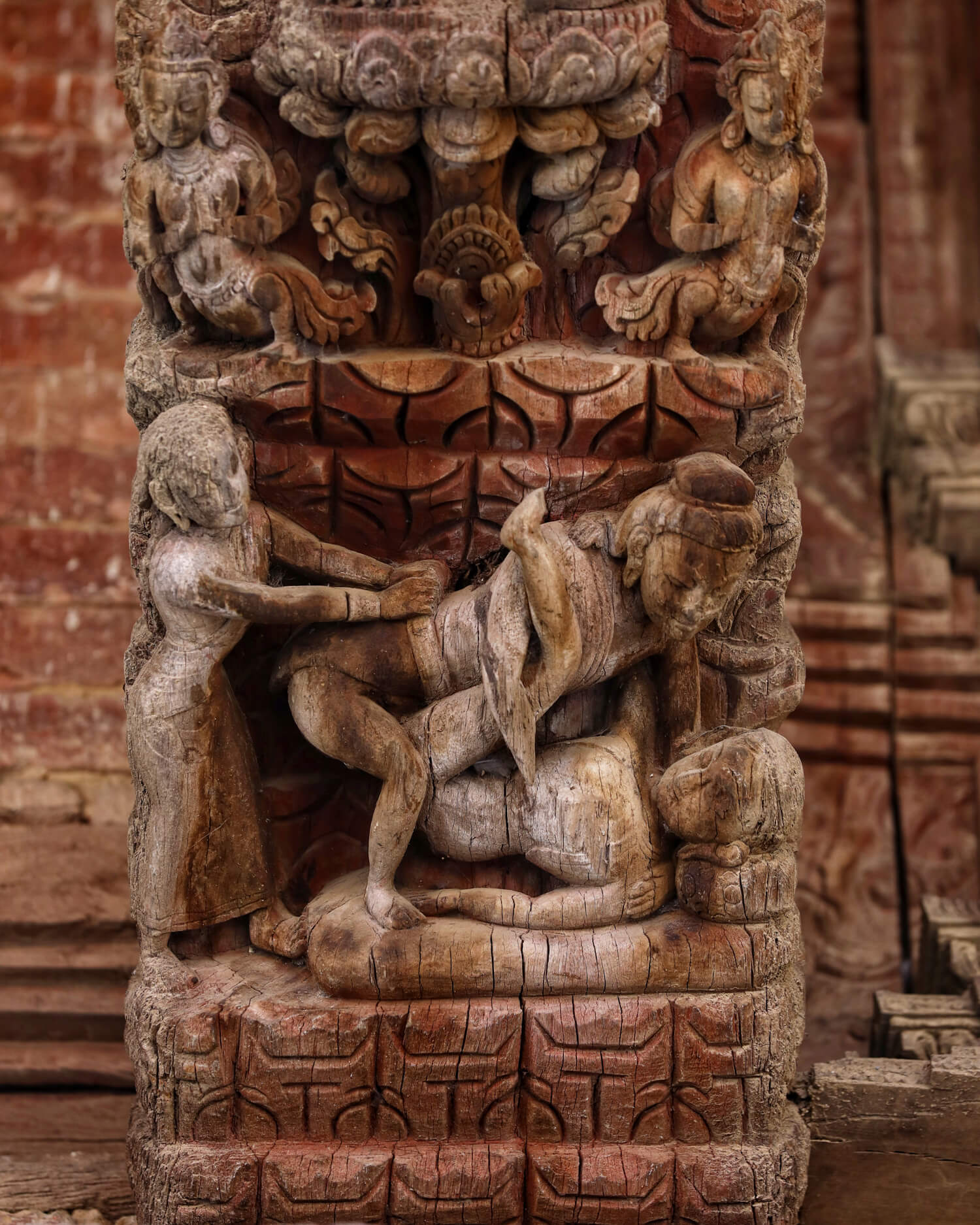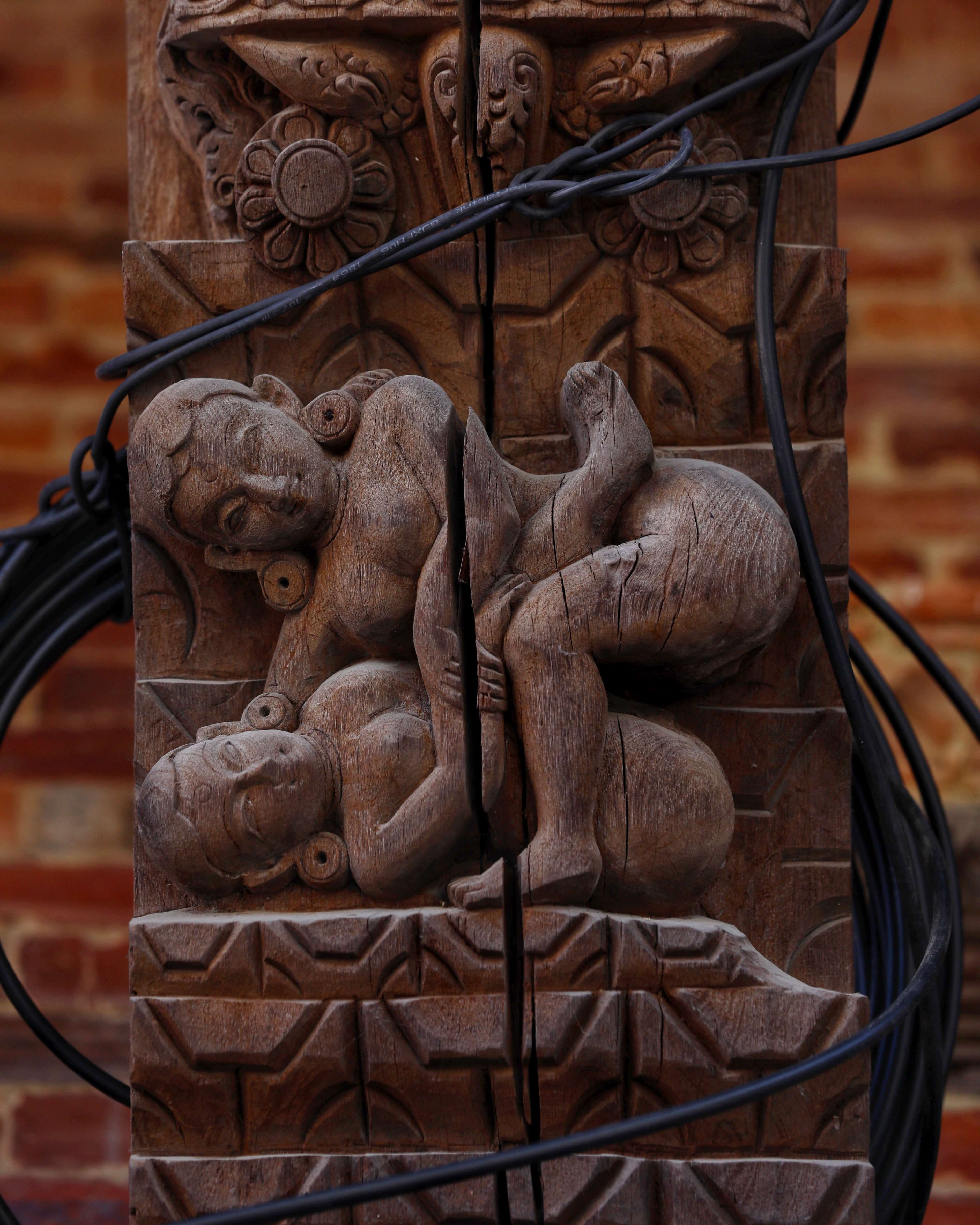 Himalayan art scholar Mary Slusser called these revolutionary inclusions ‘blatant erotica’. The erotic art on temple struts (maithuna) flourished in the 16th Century, depicting couples interlocked and entwined in bold acrobatic positions that are immediately arresting to witness. Many struts had groups, sometimes with even animals participating.