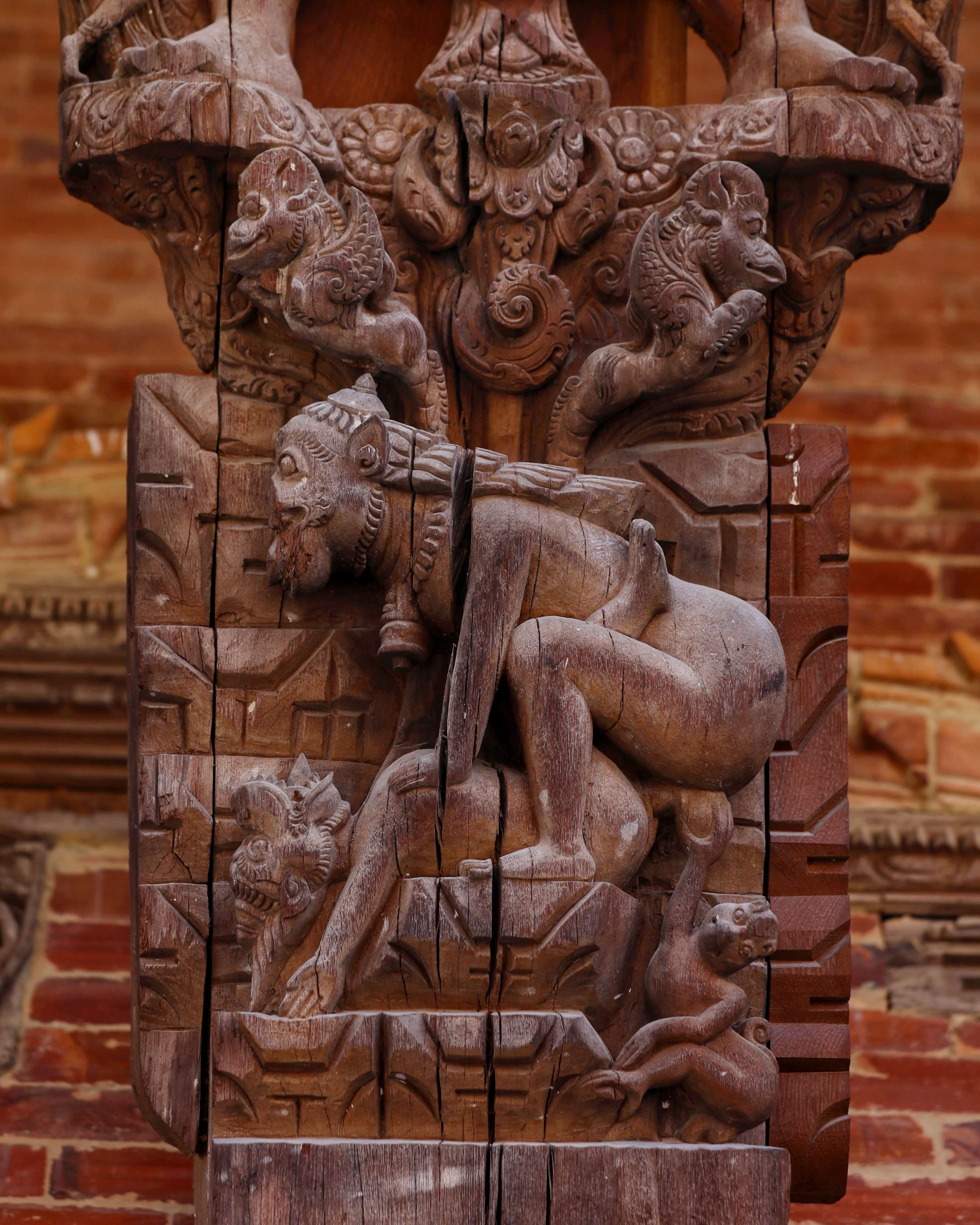 The imaginations of the wood carvers of the past have no limit. They are bold, unfettered and expansive, and nothing is profane or strange. One popular motif found in the carvings in the Valley is a bowl or a jug, often carried by an attendant or a monkey. These vessels are strategically placed under the sex organs as if to collect the fluids. Chazot explains that this could be to signify the importance of sexual fluids, which would be ritual offerings.