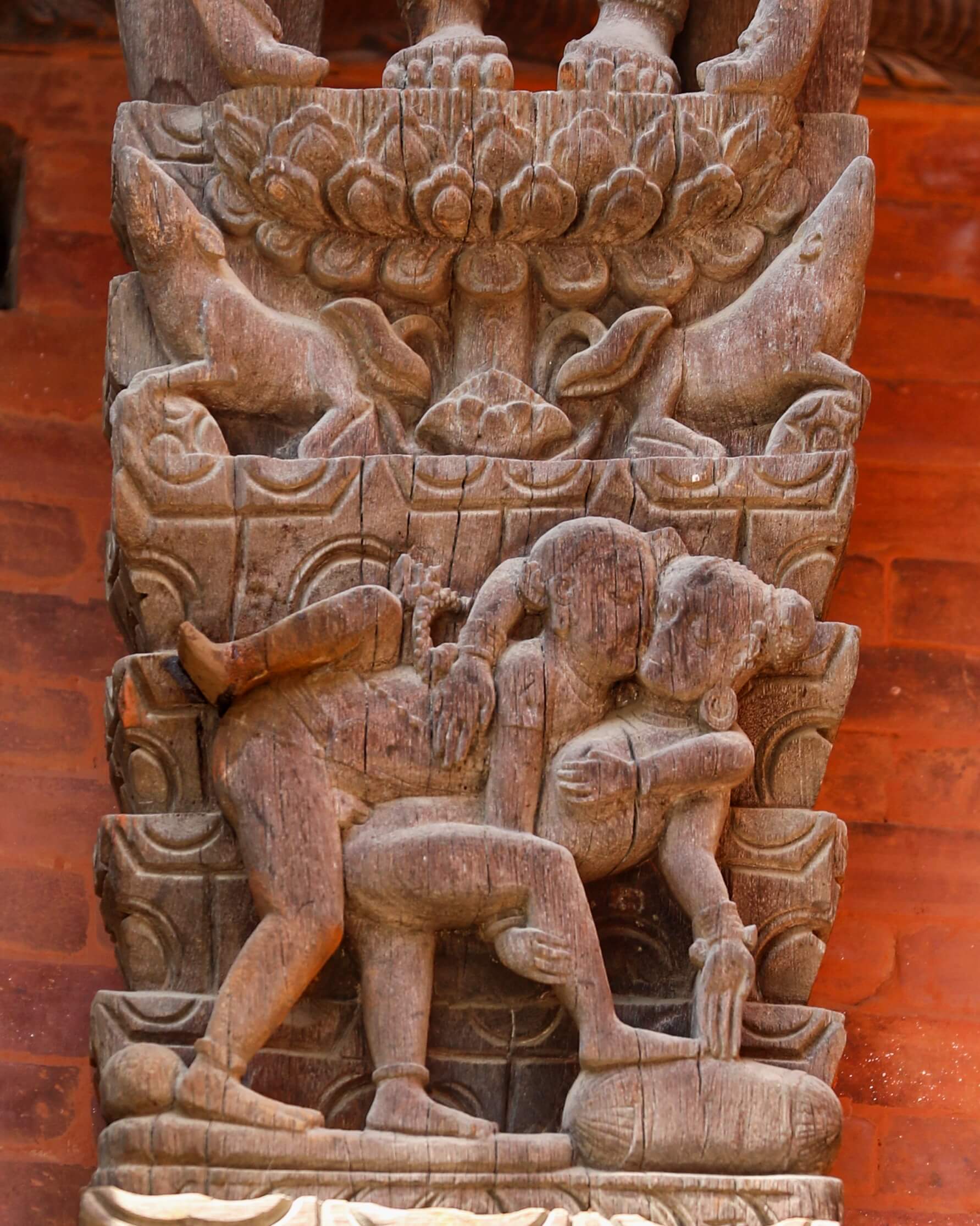 However, on the Indreshwar Mahadev in Panauti, craftsmen nearly 1,000 years ago broke from tradition and besides carving the figures of various deities, including characters from the Mahabharat and Ramayan along 16 of the lower-level struts, added at their bases men and women joined in amorous positions.