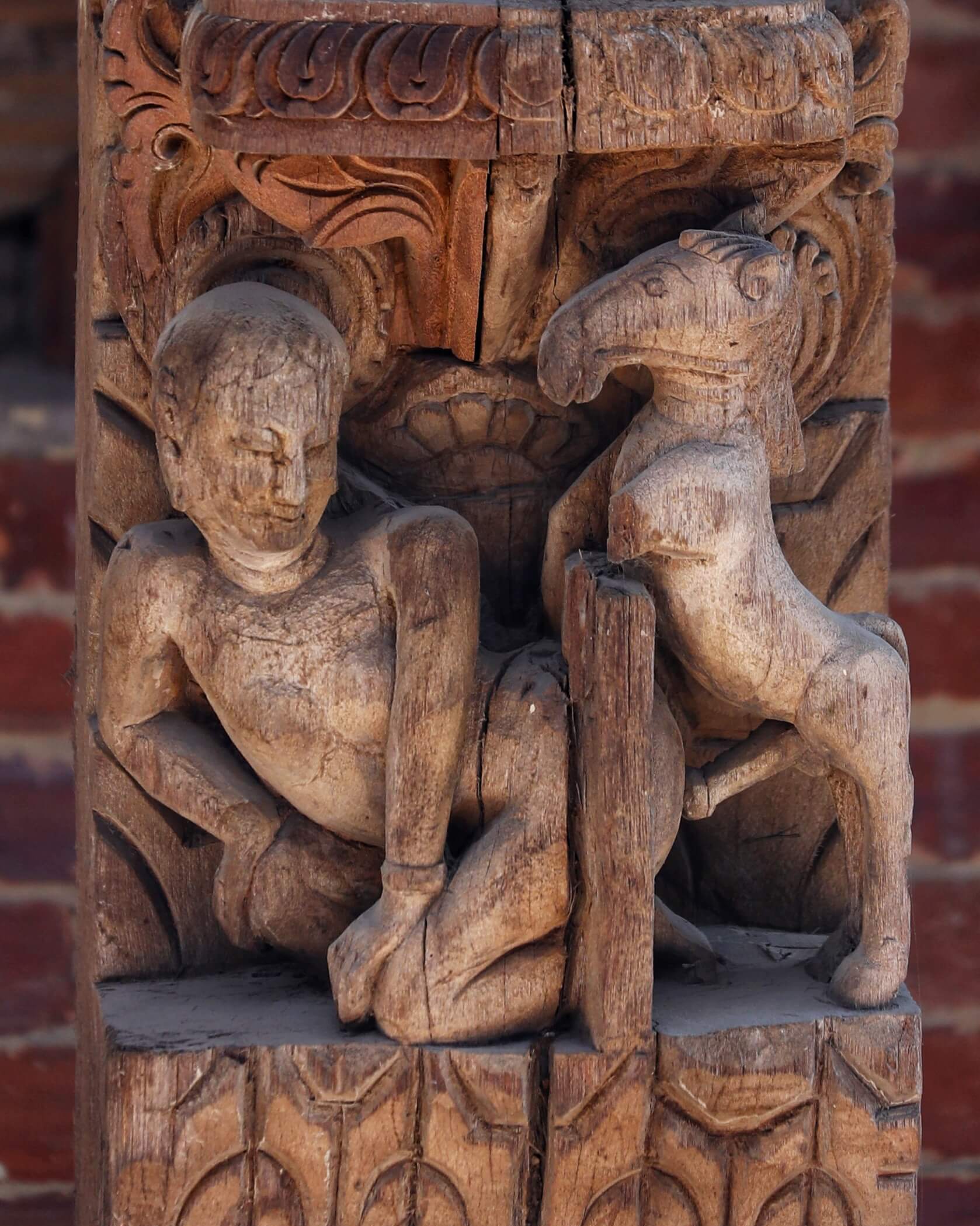 Just around the corner from the temple, through a narrow alleyway, is the Laxmi-Narayan Temple, whose original stolen deity was repatriated from the United States in December 2021. All eight struts of the temple show a diverse range of sexual acts involving couples. Animals are another favourite motif, just as it is on the struts of Patan’s South Taleju temple that almost exclusively depict copulating horses, cattle, deer and lions.